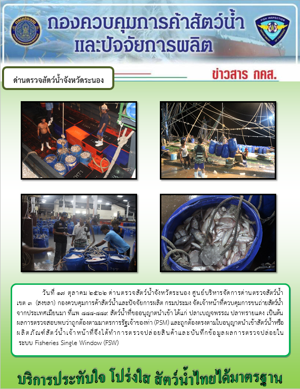 วันที่ 17 ตุลาคม 2562 ด่านตรวจสัตว์น้ำจังหวัดระนอง ศูนย์บริหารจัดการด่านตรวจสัตว์น้ำ เขต 3 (สงขลา) กองควบคุมการค้าสัตว์น้ำและปัจจัยการผลิต กรมประมง จัดเจ้าหน้าที่ควบคุมการขนถ่ายสัตว์น้ำจากประเทศเมียนมา ที่แพ 888-889 สัตว์น้ำที่ขออนุญาตนำเข้า ได้แก่ ปลาเบญจพรรณ ปลาทรายแดง เป็นต้น ผลการตรวจสอบพบว่าถูกต้องตามมาตรการรัฐเจ้าของท่า (PSM) และถูกต้องตรงตามใบอนุญาตนำเข้าสัตว์น้ำหรือผลิตภัณฑ์สัตว์น้ำเจ้าหน้าที่จึงได้ทำการตรวจปล่อยสินค้าและบันทึกข้อมูลผลการตรวจปล่อยในระบบ Fisheries Single Window (FSW)