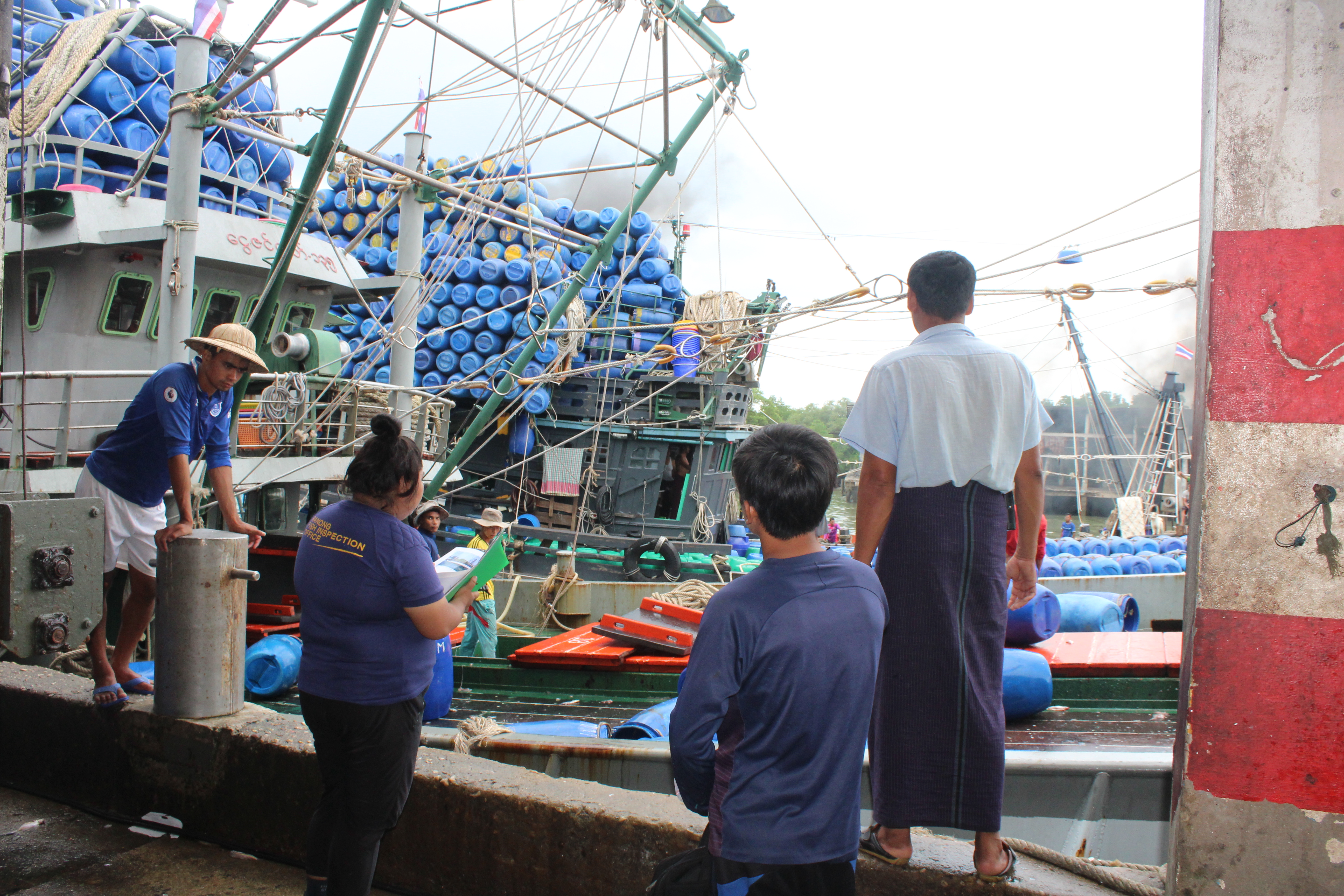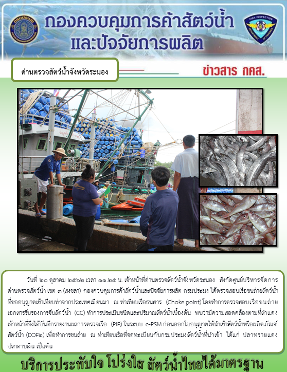 วันที่ 20 ตุลาคม 2562 เวลา 11.25 น. เจ้าหน้าที่ด่านตรวจสัตว์น้ำจังหวัดระนอง สังกัดศูนย์บริหารจัดการ ด่านตรวจสัตว์น้ำ เขต 3 (สงขลา) กองควบคุมการค้าสัตว์น้ำและปัจจัยการผลิต กรมประมง ได้ตรวจสอบเรือขนถ่ายสัตว์น้ำ ที่ขออนุญาตเข้าเทียบท่าจากประเทศเมียนมา ณ ท่าเทียบเรือธนสาร (Choke point) โดยทำการตรวจสอบเรือขนถ่าย เอกสารรับรองการจับสัตว์น้ำ (CC) ทำการประเมินชนิดและปริมาณสัตว์น้ำเบื้องต้น พบว่ามีความสอดคล้องตามที่สำแดง เจ้าหน้าที่จึงได้บันทึกรายงานผลการตรวจเรือ (PIR) ในระบบ e-PSM ก่อนออกใบอนุญาตให้นำเข้าสัตว์น้ำหรือผลิตภัณฑ์ สัตว์น้ำ (DOF2) เพื่อทำการขนถ่าย ณ ท่าเทียบเรือที่จดทะเบียนกับกรมประมงสัตว์น้ำที่นำเข้า ได้แก่ ปลาทรายแดง ปลาดาบเงิน เป็นต้น