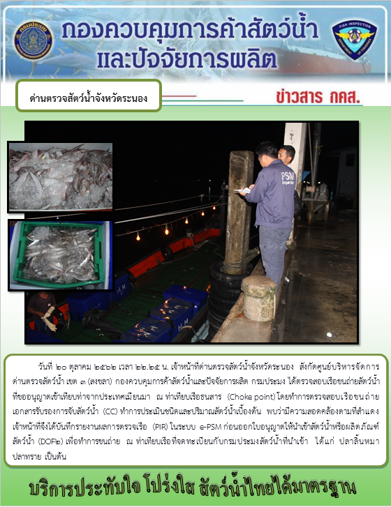 วันที่ 20 ตุลาคม 2562 เวลา 22.25 น. เจ้าหน้าที่ด่านตรวจสัตว์น้ำจังหวัดระนอง สังกัดศูนย์บริหารจัดการ ด่านตรวจสัตว์น้ำ เขต 3 (สงขลา) กองควบคุมการค้าสัตว์น้ำและปัจจัยการผลิต กรมประมง ได้ตรวจสอบเรือขนถ่ายสัตว์น้ำ ที่ขออนุญาตเข้าเทียบท่าจากประเทศเมียนมา ณ ท่าเทียบเรือธนสาร (Choke point) โดยทำการตรวจสอบเรือขนถ่าย เอกสารรับรองการจับสัตว์น้ำ (CC) ทำการประเมินชนิดและปริมาณสัตว์น้ำเบื้องต้น พบว่ามีความสอดคล้องตามที่สำแดง เจ้าหน้าที่จึงได้บันทึกรายงานผลการตรวจเรือ (PIR) ในระบบ e-PSM ก่อนออกใบอนุญาตให้นำเข้าสัตว์น้ำหรือผลิตภัณฑ์ สัตว์น้ำ (DOF2) เพื่อทำการขนถ่าย ณ ท่าเทียบเรือที่จดทะเบียนกับกรมประมงสัตว์น้ำที่นำเข้า ได้แก่ ปลาลิ้นหมา ปลาทราย เป็นต้น