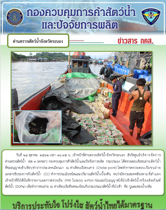 วันที่ 24 ตุลาคม 2562 เวลา 16.35 น. เจ้าหน้าที่ด่านตรวจสัตว์น้ำจังหวัดระนอง สังกัดศูนย์บริหารจัดการ ด่านตรวจสัตว์น้ำ เขต 3 (สงขลา) กองควบคุมการค้าสัตว์น้ำและปัจจัยการผลิต กรมประมง ได้ตรวจสอบเรือขนถ่ายสัตว์น้ำ ที่ขออนุญาตเข้าเทียบท่าจากประเทศเมียนมา ณ ท่าเทียบเรือธนสาร (Choke point) โดยทำการตรวจสอบเรือขนถ่าย เอกสารรับรองการจับสัตว์น้ำ (CC) ทำการประเมินชนิดและปริมาณสัตว์น้ำเบื้องต้น พบว่ามีความสอดคล้องตามที่สำแดง เจ้าหน้าที่จึงได้บันทึกรายงานผลการตรวจเรือ (PIR) ในระบบ e-PSM ก่อนออกใบอนุญาตให้นำเข้าสัตว์น้ำหรือผลิตภัณฑ์ สัตว์น้ำ (DOF2) เพื่อทำการขนถ่าย ณ ท่าเทียบเรือที่จดทะเบียนกับกรมประมงสัตว์น้ำที่นำเข้า คือ ปูแสมดองน้ำเกลือ