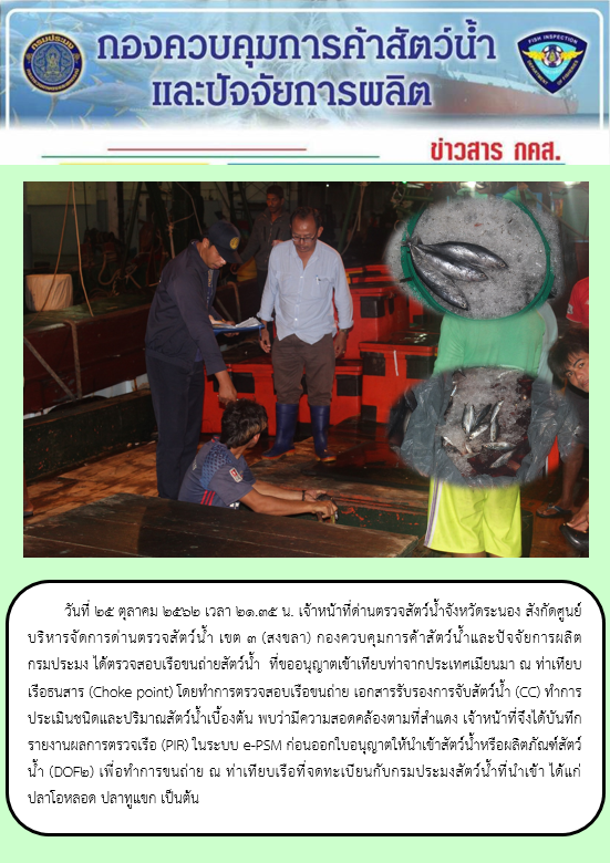 กรมประมง ได้ตรวจสอบเรือขนถ่ายสัตว์น้ำ ที่ขออนุญาตเข้าเทียบท่าจากประเทศเมียนมา ณ ท่าเทียบเรือธนสาร (Choke point) โดยทำการตรวจสอบเรือขนถ่าย เอกสารรับรองการจับสัตว์น้ำ (CC) ทำการประเมินชนิดและปริมาณสัตว์น้ำเบื้องต้น พบว่ามีความสอดคล้องตามที่สำแดง เจ้าหน้าที่จึงได้บันทึกรายงานผลการตรวจเรือ (PIR) ในระบบ e-PSM ก่อนออกใบอนุญาตให้นำเข้าสัตว์น้ำหรือผลิตภัณฑ์สัตว์น้ำ (DOF2) เพื่อทำการขนถ่าย ณ ท่าเทียบเรือที่จดทะเบียนกับกรมประมงสัตว์น้ำที่นำเข้า ได้แก่ ปลาโอหลอด ปลาทูแขก เป็นต้น