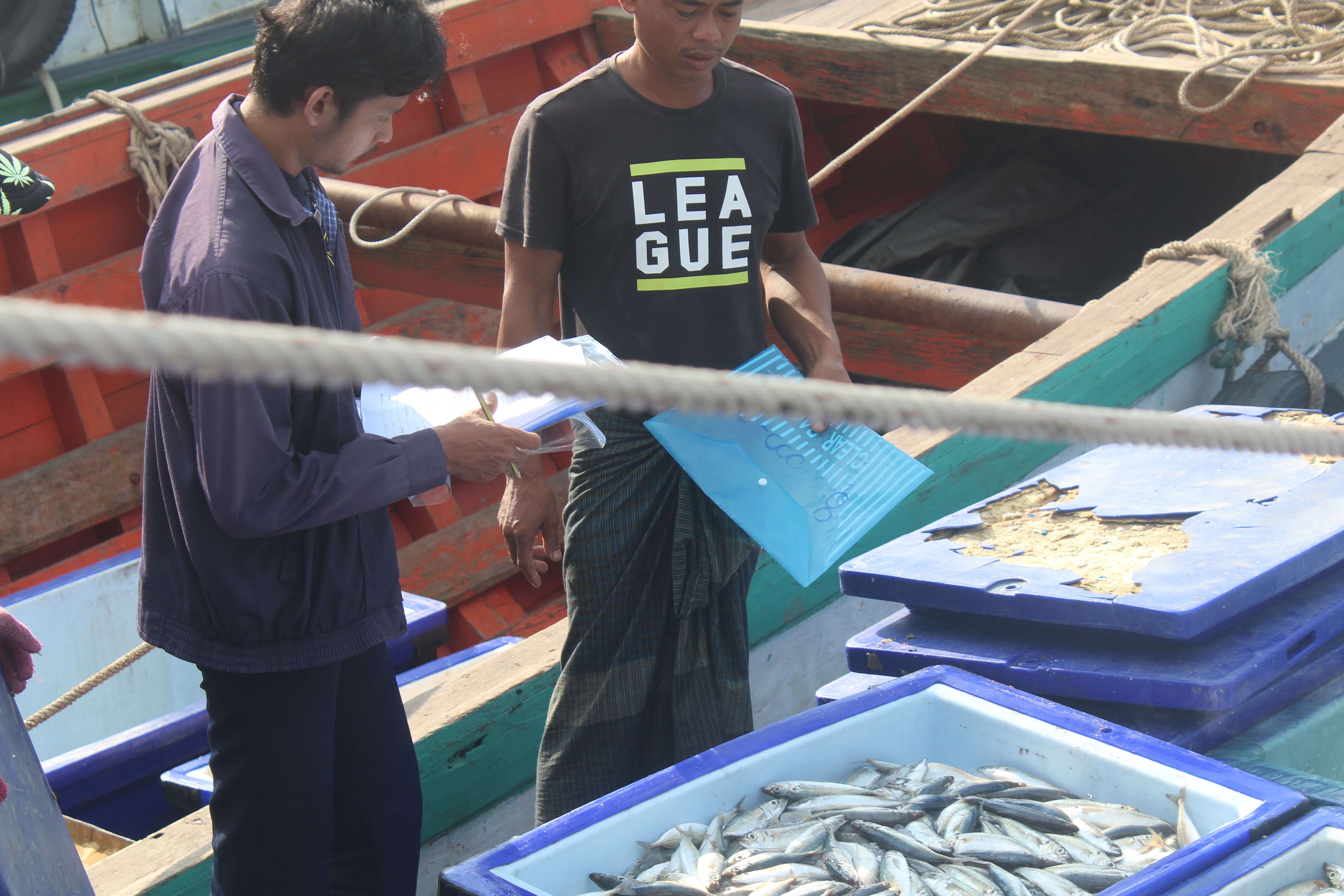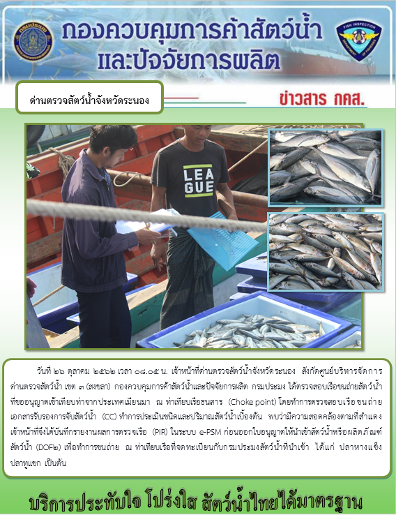 วันที่ 26 ตุลาคม 2562 เวลา 08.05 น. เจ้าหน้าที่ด่านตรวจสัตว์น้ำจังหวัดระนอง สังกัดศูนย์บริหารจัดการ ด่านตรวจสัตว์น้ำ เขต 3 (สงขลา) กองควบคุมการค้าสัตว์น้ำและปัจจัยการผลิต กรมประมง ได้ตรวจสอบเรือขนถ่ายสัตว์น้ำ ที่ขออนุญาตเข้าเทียบท่าจากประเทศเมียนมา ณ ท่าเทียบเรือธนสาร (Choke point) โดยทำการตรวจสอบเรือขนถ่าย เอกสารรับรองการจับสัตว์น้ำ (CC) ทำการประเมินชนิดและปริมาณสัตว์น้ำเบื้องต้น พบว่ามีความสอดคล้องตามที่สำแดง เจ้าหน้าที่จึงได้บันทึกรายงานผลการตรวจเรือ (PIR) ในระบบ e-PSM ก่อนออกใบอนุญาตให้นำเข้าสัตว์น้ำหรือผลิตภัณฑ์ สัตว์น้ำ (DOF2) เพื่อทำการขนถ่าย ณ ท่าเทียบเรือที่จดทะเบียนกับกรมประมงสัตว์น้ำที่นำเข้า ได้แก่ ปลาหางแข็งปลาทูแขก เป็นต้น