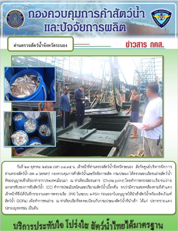 วันที่ 27 ตุลาคม 2562 เวลา 08.35 น. เจ้าหน้าที่ด่านตรวจสัตว์น้ำจังหวัดระนอง สังกัดศูนย์บริหารจัดการ ด่านตรวจสัตว์น้ำ เขต 3 (สงขลา) กองควบคุมการค้าสัตว์น้ำและปัจจัยการผลิต กรมประมง ได้ตรวจสอบเรือขนถ่ายสัตว์น้ำ ที่ขออนุญาตเข้าเทียบท่าจากประเทศเมียนมา ณ ท่าเทียบเรือธนสาร (Choke point) โดยทำการตรวจสอบเรือขนถ่าย เอกสารรับรองการจับสัตว์น้ำ (CC) ทำการประเมินชนิดและปริมาณสัตว์น้ำเบื้องต้น พบว่ามีความสอดคล้องตามที่สำแดง เจ้าหน้าที่จึงได้บันทึกรายงานผลการตรวจเรือ (PIR) ในระบบ e-PSM ก่อนออกใบอนุญาตให้นำเข้าสัตว์น้ำหรือผลิตภัณฑ์ สัตว์น้ำ (DOF2) เพื่อทำการขนถ่าย ณ ท่าเทียบเรือที่จดทะเบียนกับกรมประมงสัตว์น้ำที่นำเข้า ได้แก่ ปลาทรายแดง ปลาเบญจพรรณ เป็นต้น