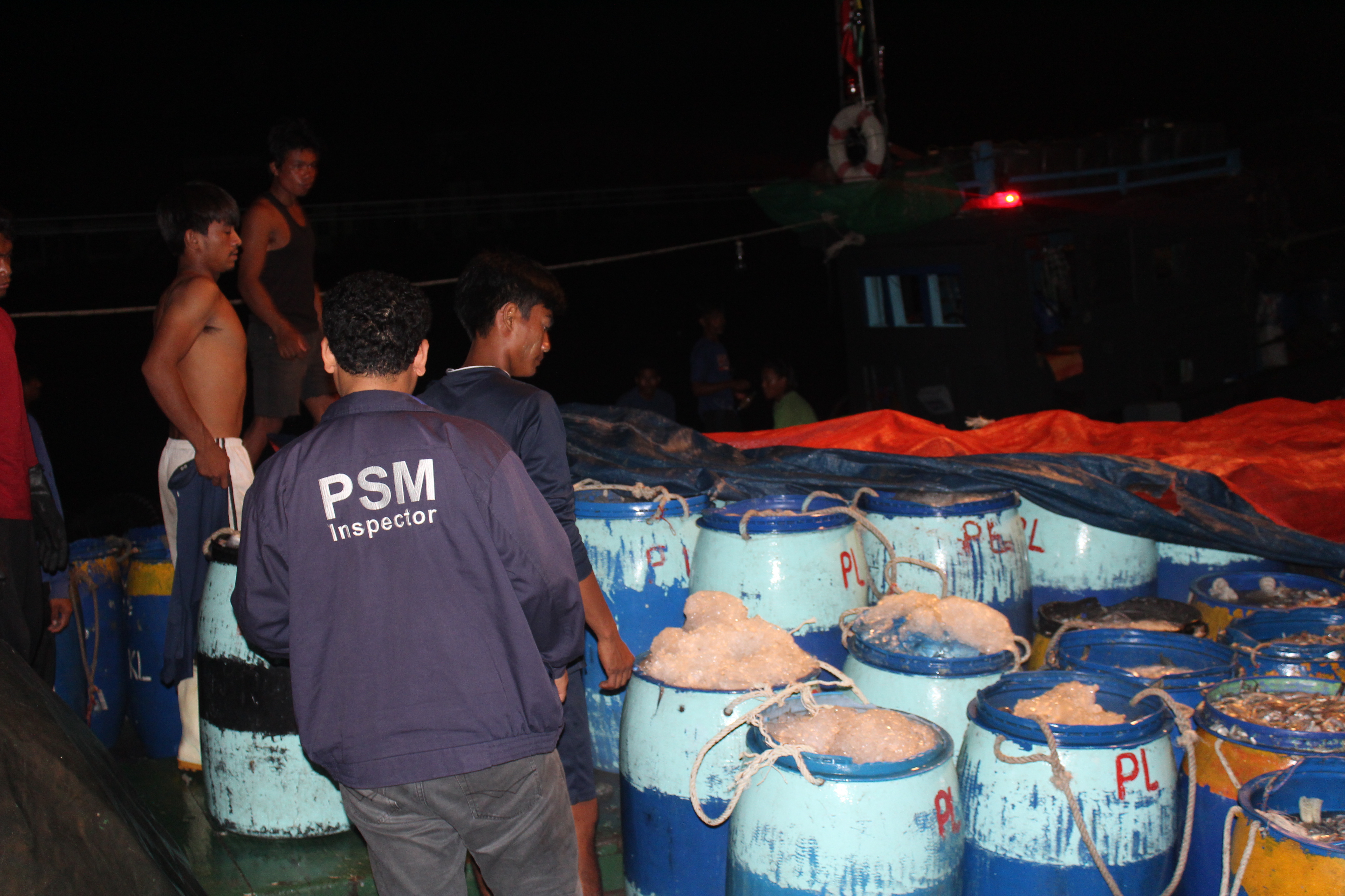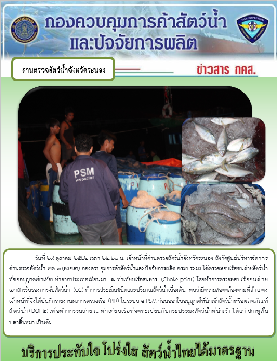 วันที่ 29 ตุลาคม 2562 เวลา 22.20 น. เจ้าหน้าที่ด่านตรวจสัตว์น้ำจังหวัดระนอง สังกัดศูนย์บริหารจัดการ ด่านตรวจสัตว์น้ำ เขต 3 (สงขลา) กองควบคุมการค้าสัตว์น้ำและปัจจัยการผลิต กรมประมง ได้ตรวจสอบเรือขนถ่ายสัตว์น้ำ ที่ขออนุญาตเข้าเทียบท่าจากประเทศเมียนมา ณ ท่าเทียบเรือธนสาร (Choke point) โดยทำการตรวจสอบเรือขนถ่าย เอกสารรับรองการจับสัตว์น้ำ (CC) ทำการประเมินชนิดและปริมาณสัตว์น้ำเบื้องต้น พบว่ามีความสอดคล้องตามที่สำแดง เจ้าหน้าที่จึงได้บันทึกรายงานผลการตรวจเรือ (PIR) ในระบบ e-PSM ก่อนออกใบอนุญาตให้นำเข้าสัตว์น้ำหรือผลิตภัณฑ์ สัตว์น้ำ (DOF2) เพื่อทำการขนถ่าย ณ ท่าเทียบเรือที่จดทะเบียนกับกรมประมงสัตว์น้ำที่นำเข้า ได้แก่ ปลาทูสั้น ปลาลิ้นหมา เป็นต้น