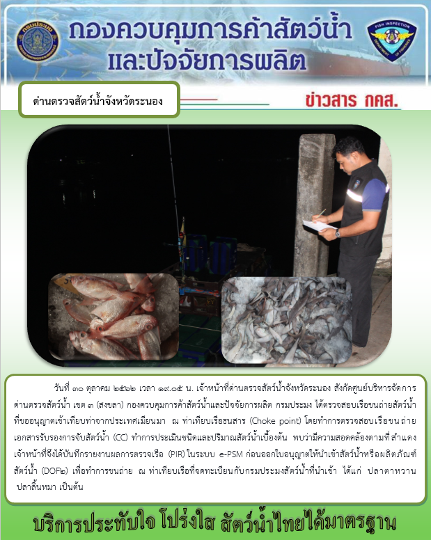 วันที่ 30 ตุลาคม 2562 เวลา 19.05 น. เจ้าหน้าที่ด่านตรวจสัตว์น้ำจังหวัดระนอง สังกัดศูนย์บริหารจัดการ ด่านตรวจสัตว์น้ำ เขต 3 (สงขลา) กองควบคุมการค้าสัตว์น้ำและปัจจัยการผลิต กรมประมง ได้ตรวจสอบเรือขนถ่ายสัตว์น้ำ ที่ขออนุญาตเข้าเทียบท่าจากประเทศเมียนมา ณ ท่าเทียบเรือธนสาร (Choke point) โดยทำการตรวจสอบเรือขนถ่าย เอกสารรับรองการจับสัตว์น้ำ (CC) ทำการประเมินชนิดและปริมาณสัตว์น้ำเบื้องต้น พบว่ามีความสอดคล้องตามที่สำแดง เจ้าหน้าที่จึงได้บันทึกรายงานผลการตรวจเรือ (PIR) ในระบบ e-PSM ก่อนออกใบอนุญาตให้นำเข้าสัตว์น้ำหรือผลิตภัณฑ์ สัตว์น้ำ (DOF2) เพื่อทำการขนถ่าย ณ ท่าเทียบเรือที่จดทะเบียนกับกรมประมงสัตว์น้ำที่นำเข้า ได้แก่ ปลาตาหวาน ปลาลิ้นหมา เป็นต้น