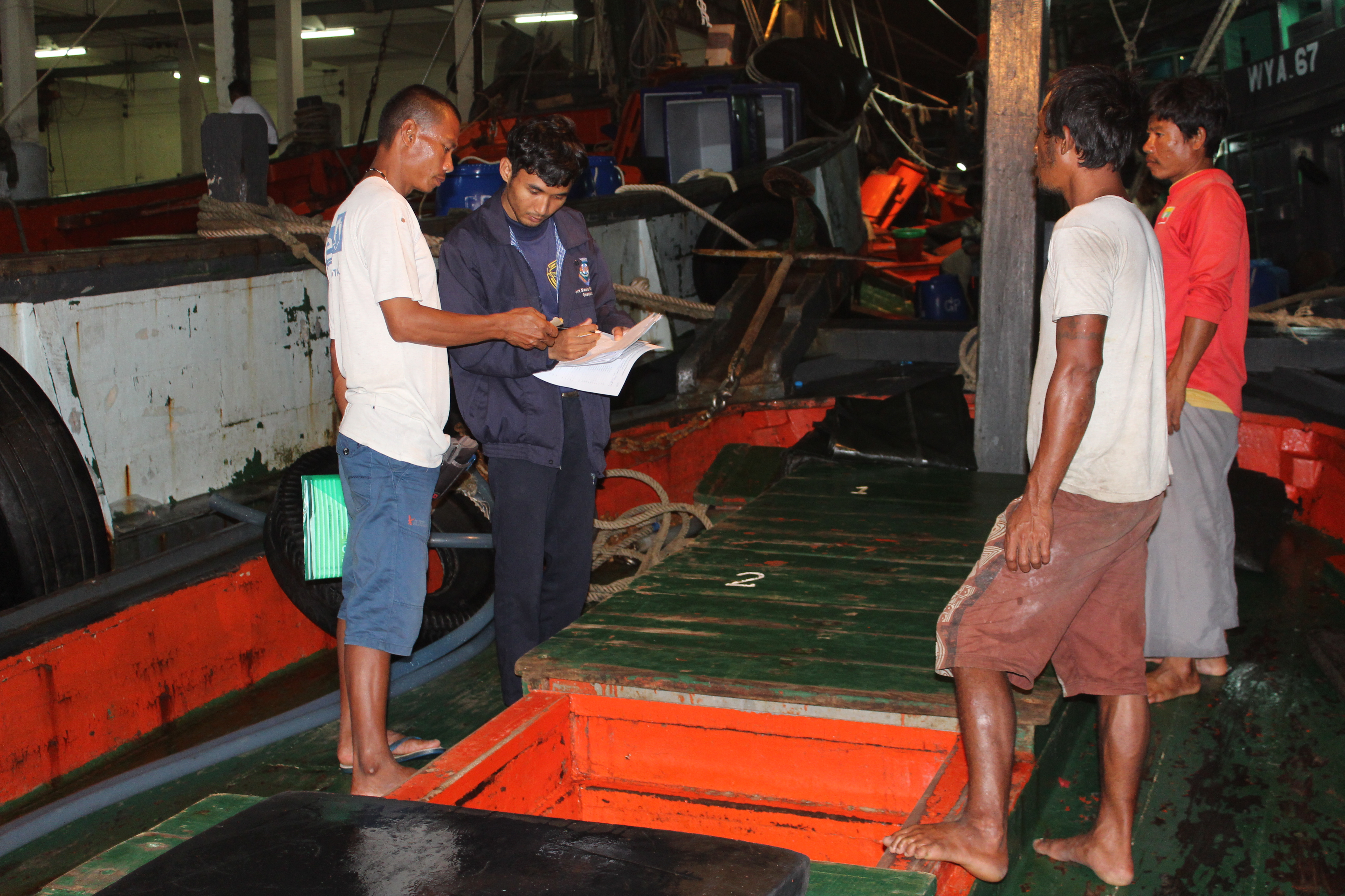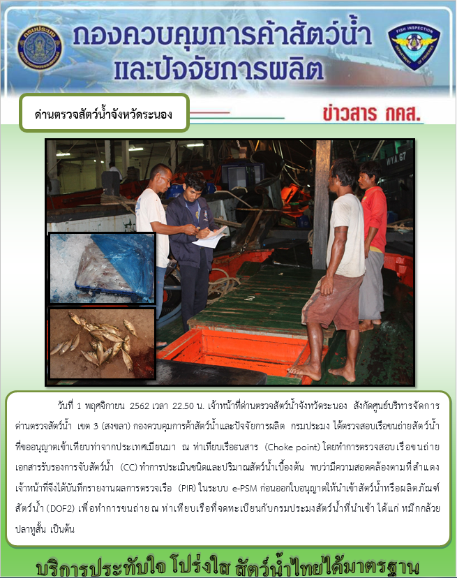 วันที่ 1 พฤศจิกายน 2562 เวลา 22.50 น. เจ้าหน้าที่ด่านตรวจสัตว์น้ำจังหวัดระนอง สังกัดศูนย์บริหารจัดการ ด่านตรวจสัตว์น้ำ เขต 3 (สงขลา) กองควบคุมการค้าสัตว์น้ำและปัจจัยการผลิต กรมประมง ได้ตรวจสอบเรือขนถ่ายสัตว์น้ำ ที่ขออนุญาตเข้าเทียบท่าจากประเทศเมียนมา ณ ท่าเทียบเรือธนสาร (Choke point) โดยทำการตรวจสอบเรือขนถ่าย เอกสารรับรองการจับสัตว์น้ำ (CC) ทำการประเมินชนิดและปริมาณสัตว์น้ำเบื้องต้น พบว่ามีความสอดคล้องตามที่สำแดง เจ้าหน้าที่จึงได้บันทึกรายงานผลการตรวจเรือ (PIR) ในระบบ e-PSM ก่อนออกใบอนุญาตให้นำเข้าสัตว์น้ำหรือผลิตภัณฑ์ สัตว์น้ำ (DOF2) เพื่อทำการขนถ่าย ณ ท่าเทียบเรือที่จดทะเบียนกับกรมประมงสัตว์น้ำที่นำเข้า ได้แก่ หมึกกล้วย ปลาทูสั้น เป็นต้น