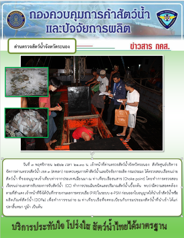 วันที่ 3 พฤศจิกายน 2562 เวลา 21.30 น. เจ้าหน้าที่ด่านตรวจสัตว์น้ำจังหวัดระนอง สังกัดศูนย์บริหารจัดการด่านตรวจสัตว์น้ำ เขต 3 (สงขลา) กองควบคุมการค้าสัตว์น้ำและปัจจัยการผลิต กรมประมง ได้ตรวจสอบเรือขนถ่ายสัตว์น้ำ ที่ขออนุญาตเข้าเทียบท่าจากประเทศเมียนมา ณ ท่าเทียบเรือธนสาร (Choke point) โดยทำการตรวจสอบ เรือขนถ่ายเอกสารรับรองการจับสัตว์น้ำ (CC) ทำการประเมินชนิดและปริมาณสัตว์น้ำเบื้องต้น พบว่ามีความสอดคล้อง ตามที่สำแดง เจ้าหน้าที่จึงได้บันทึกรายงานผลการตรวจเรือ (PIR) ในระบบ e-PSM ก่อนออกใบอนุญาตให้นำเข้าสัตว์น้ำหรือผลิตภัณฑ์สัตว์น้ำ (DOF2) เพื่อทำการขนถ่าย ณ ท่าเทียบเรือที่จดทะเบียนกับกรมประมงสัตว์น้ำที่นำเข้า ได้แก่ ปลาลิ้นหมา ปูม้า เป็นต้น