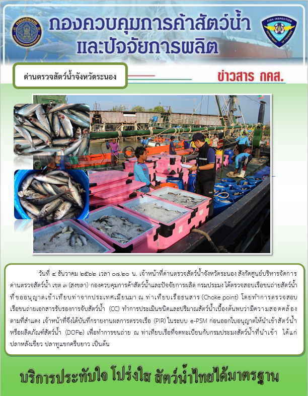 วันที่ 4 ธันวาคม 2562 เวลา 08.20 น. เจ้าหน้าที่ด่านตรวจสัตว์น้ำจังหวัดระนอง สังกัดศูนย์บริหารจัดการด่านตรวจสัตว์น้ำ เขต 3 (สงขลา) กองควบคุมการค้าสัตว์น้ำและปัจจัยการผลิต กรมประมง ได้ตรวจสอบเรือขนถ่ายสัตว์น้ำ ที่ขออนุญาตเข้าเทียบท่าจากประเทศเมียนมา ณ ท่าเทียบเรือธนสาร (Choke point) โดยทำการตรวจสอบเรือขนถ่ายเอกสารรับรองการจับสัตว์น้ำ (CC) ทำการประเมินชนิดและปริมาณสัตว์น้ำเบื้องต้นพบว่ามีความสอดคล้อง ตามที่สำแดง เจ้าหน้าที่จึงได้บันทึกรายงานผลการตรวจเรือ (PIR) ในระบบ e-PSM ก่อนออกใบอนุญาตให้นำเข้าสัตว์น้ำ หรือผลิตภัณฑ์สัตว์น้ำ (DOF2) เพื่อทำการขนถ่าย ณ ท่าเทียบเรือที่จดทะเบียนกับกรมประมงสัตว์น้ำที่นำเข้า ได้แก่ ปลาหลังเขียว ปลาทูแขกครีบยาว เป็นต้น