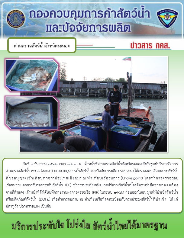 วันที่ 4 ธันวาคม 2562 เวลา 18.00 น. เจ้าหน้าที่ด่านตรวจสัตว์น้ำจังหวัดระนอง สังกัดศูนย์บริหารจัดการด่านตรวจสัตว์น้ำ เขต 3 (สงขลา) กองควบคุมการค้าสัตว์น้ำและปัจจัยการผลิต กรมประมง ได้ตรวจสอบเรือขนถ่ายสัตว์น้ำ ที่ขออนุญาตเข้าเทียบท่าจากประเทศเมียนมา ณ ท่าเทียบเรือธนสาร (Choke point) โดยทำการตรวจสอบเรือขนถ่ายเอกสารรับรองการจับสัตว์น้ำ (CC) ทำการประเมินชนิดและปริมาณสัตว์น้ำเบื้องต้นพบว่ามีความสอดคล้อง ตามที่สำแดง เจ้าหน้าที่จึงได้บันทึกรายงานผลการตรวจเรือ (PIR) ในระบบ e-PSM ก่อนออกใบอนุญาตให้นำเข้าสัตว์น้ำ หรือผลิตภัณฑ์สัตว์น้ำ (DOF2) เพื่อทำการขนถ่าย ณ ท่าเทียบเรือที่จดทะเบียนกับกรมประมงสัตว์น้ำที่นำเข้า ได้แก่ ปลาทูลัง ปลาทรายแดง เป็นต้นวันที่ 4 ธันวาคม 2562 เวลา 18.00 น. เจ้าหน้าที่ด่านตรวจสัตว์น้ำจังหวัดระนอง สังกัดศูนย์บริหารจัดการด่านตรวจสัตว์น้ำ เขต 3 (สงขลา) กองควบคุมการค้าสัตว์น้ำและปัจจัยการผลิต กรมประมง ได้ตรวจสอบเรือขนถ่ายสัตว์น้ำ ที่ขออนุญาตเข้าเทียบท่าจากประเทศเมียนมา ณ ท่าเทียบเรือธนสาร (Choke point) โดยทำการตรวจสอบเรือขนถ่ายเอกสารรับรองการจับสัตว์น้ำ (CC) ทำการประเมินชนิดและปริมาณสัตว์น้ำเบื้องต้นพบว่ามีความสอดคล้อง ตามที่สำแดง เจ้าหน้าที่จึงได้บันทึกรายงานผลการตรวจเรือ (PIR) ในระบบ e-PSM ก่อนออกใบอนุญาตให้นำเข้าสัตว์น้ำ หรือผลิตภัณฑ์สัตว์น้ำ (DOF2) เพื่อทำการขนถ่าย ณ ท่าเทียบเรือที่จดทะเบียนกับกรมประมงสัตว์น้ำที่นำเข้า ได้แก่ ปลาทูลัง ปลาทรายแดง เป็นต้น