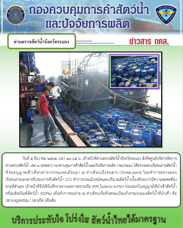 วันที่ 5 ธันวาคม 2562 เวลา 16.05 น. เจ้าหน้าที่ด่านตรวจสัตว์น้ำจังหวัดระนอง สังกัดศูนย์บริหารจัดการด่านตรวจสัตว์น้ำ เขต 3 (สงขลา) กองควบคุมการค้าสัตว์น้ำและปัจจัยการผลิต กรมประมง ได้ตรวจสอบเรือขนถ่ายสัตว์น้ำ ที่ขออนุญาตเข้าเทียบท่าจากประเทศเมียนมา ณ ท่าเทียบเรือธนสาร (Choke point) โดยทำการตรวจสอบเรือขนถ่ายเอกสารรับรองการจับสัตว์น้ำ (CC) ทำการประเมินชนิดและปริมาณสัตว์น้ำเบื้องต้นพบว่ามีความสอดคล้อง ตามที่สำแดง เจ้าหน้าที่จึงได้บันทึกรายงานผลการตรวจเรือ (PIR) ในระบบ e-PSM ก่อนออกใบอนุญาตให้นำเข้าสัตว์น้ำ หรือผลิตภัณฑ์สัตว์น้ำ (DOF2) เพื่อทำการขนถ่าย ณ ท่าเทียบเรือที่จดทะเบียนกับกรมประมงสัตว์น้ำที่นำเข้า คือปลาเบญจพรรณ ( ปลาเป็ด )เป็นต้น