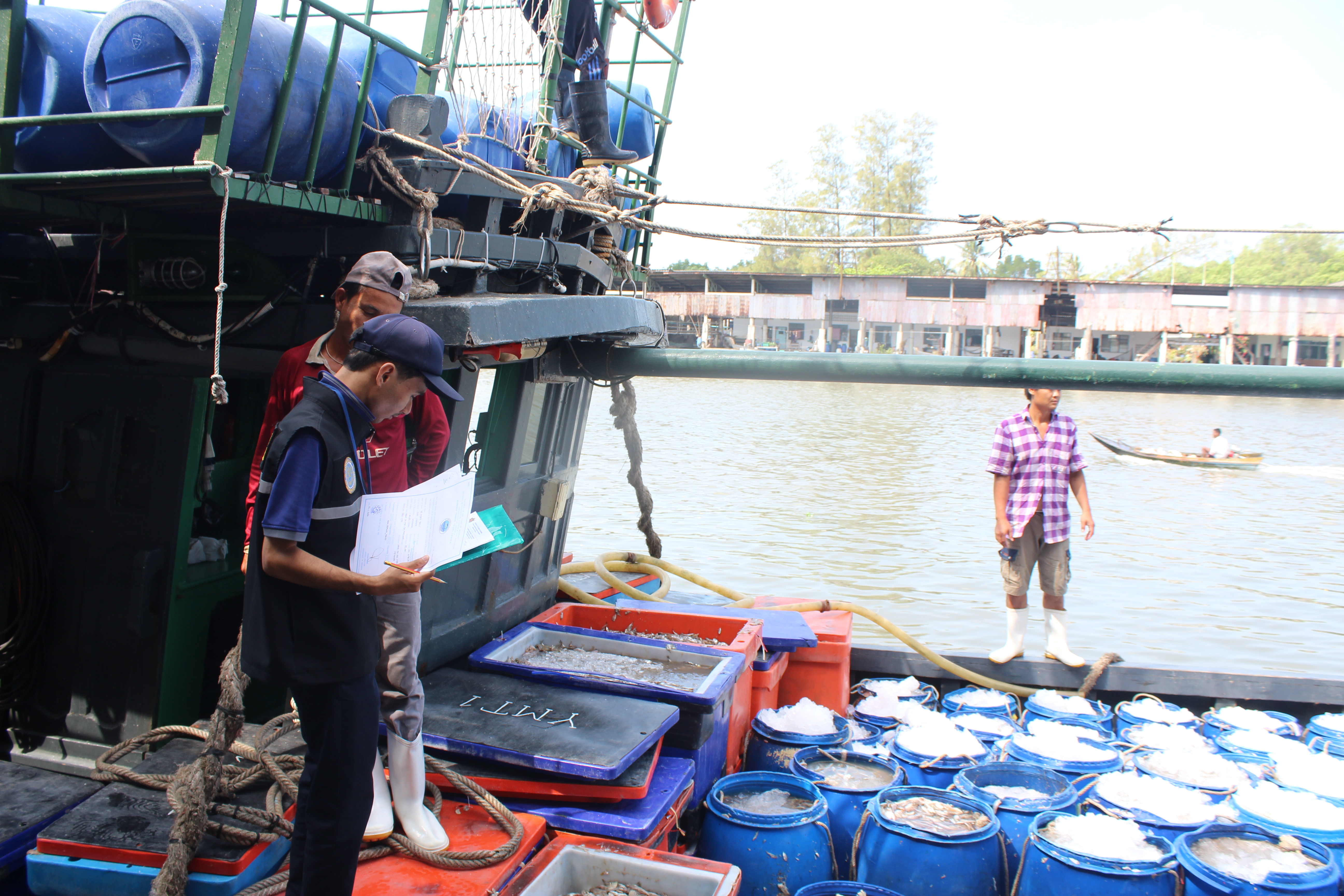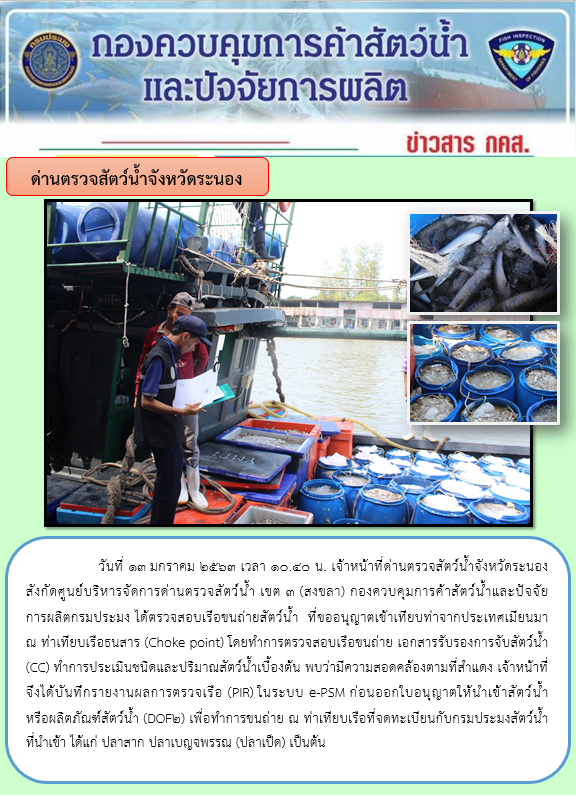 วันที่ 13 มกราคม 2563 เวลา 10.40 น. เจ้าหน้าที่ด่านตรวจสัตว์น้ำจังหวัดระนอง สังกัดศูนย์บริหารจัดการด่านตรวจสัตว์น้ำ เขต 3 (สงขลา) กองควบคุมการค้าสัตว์น้ำและปัจจัย การผลิตกรมประมง ได้ตรวจสอบเรือขนถ่ายสัตว์น้ำ ที่ขออนุญาตเข้าเทียบท่าจากประเทศเมียนมา ณ ท่าเทียบเรือธนสาร (Choke point) โดยทำการตรวจสอบเรือขนถ่าย เอกสารรับรองการจับสัตว์น้ำ (CC) ทำการประเมินชนิดและปริมาณสัตว์น้ำเบื้องต้น พบว่ามีความสอดคล้องตามที่สำแดง เจ้าหน้าที่จึงได้บันทึกรายงานผลการตรวจเรือ (PIR) ในระบบ e-PSM ก่อนออกใบอนุญาตให้นำเข้าสัตว์น้ำหรือผลิตภัณฑ์สัตว์น้ำ (DOF2) เพื่อทำการขนถ่าย ณ ท่าเทียบเรือที่จดทะเบียนกับกรมประมงสัตว์น้ำที่นำเข้า ได้แก่ ปลาสาก ปลาเบญจพรรณ (ปลาเป็ด) เป็นต้น