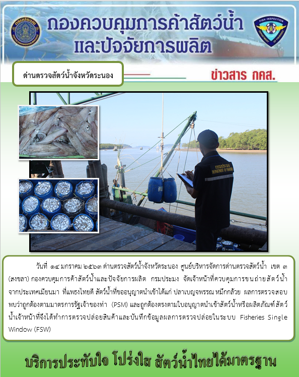 วันที่ 14 มกราคม 2563 ด่านตรวจสัตว์น้ำจังหวัดระนอง ศูนย์บริหารจัดการด่านตรวจสัตว์น้ำ เขต 3 (สงขลา) กองควบคุมการค้าสัตว์น้ำและปัจจัยการผลิต กรมประมง จัดเจ้าหน้าที่ควบคุมการขนถ่ายสัตว์น้ำจากประเทศเมียนมา ที่แพธงไทยดี สัตว์น้ำที่ขออนุญาตนำเข้าได้แก่ ปลาเบญจพรรณ หมึกกล้วย ผลการตรวจสอบพบว่าถูกต้องตามมาตรการรัฐเจ้าของท่า (PSM) และถูกต้องตรงตามใบอนุญาตนำเข้าสัตว์น้ำหรือผลิตภัณฑ์สัตว์น้ำเจ้าหน้าที่จึงได้ทำการตรวจปล่อยสินค้าและบันทึกข้อมูลผลการตรวจปล่อยในระบบ Fisheries Single Window (FSW)