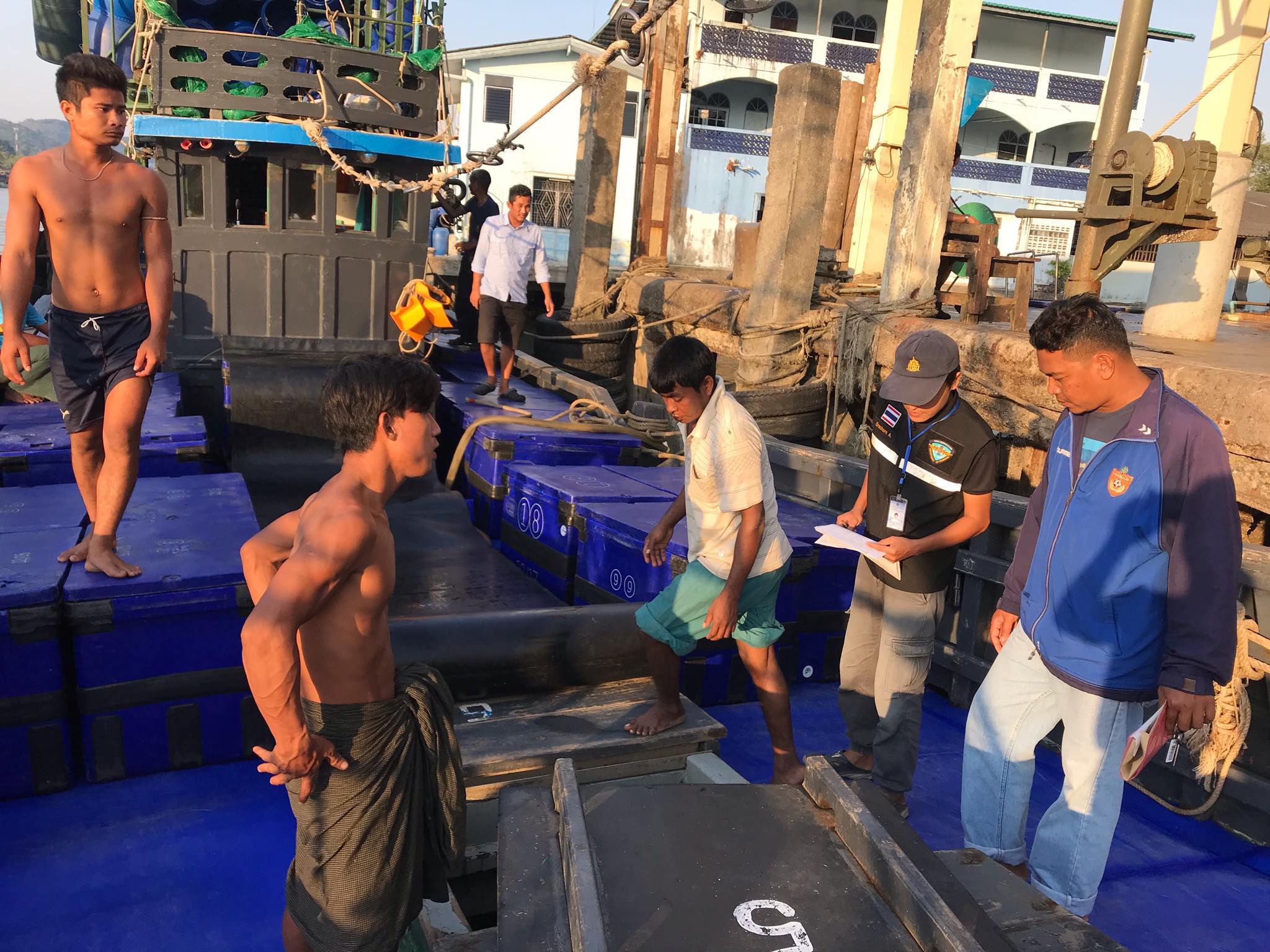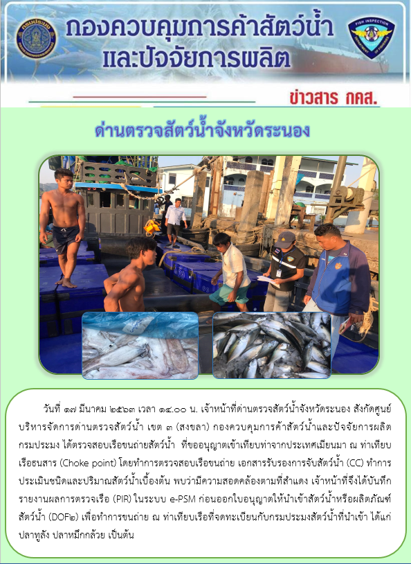 วันที่ 17 มีนาคม 2563 เวลา 14.00 น. เจ้าหน้าที่ด่านตรวจสัตว์น้ำจังหวัดระนอง สังกัดศูนย์บริหารจัดการด่านตรวจสัตว์น้ำ เขต 3 (สงขลา) กองควบคุมการค้าสัตว์น้ำและปัจจัยการผลิตกรมประมง ได้ตรวจสอบเรือขนถ่ายสัตว์น้ำ ที่ขออนุญาตเข้าเทียบท่าจากประเทศเมียนมา ณ ท่าเทียบเรือธนสาร (Choke point) โดยทำการตรวจสอบเรือขนถ่าย เอกสารรับรองการจับสัตว์น้ำ (CC) ทำการประเมินชนิดและปริมาณสัตว์น้ำเบื้องต้น พบว่ามีความสอดคล้องตามที่สำแดง เจ้าหน้าที่จึงได้บันทึกรายงานผลการตรวจเรือ (PIR) ในระบบ e-PSM ก่อนออกใบอนุญาตให้นำเข้าสัตว์น้ำหรือผลิตภัณฑ์สัตว์น้ำ (DOF2) เพื่อทำการขนถ่าย ณ ท่าเทียบเรือที่จดทะเบียนกับกรมประมงสัตว์น้ำที่นำเข้า ได้แก่ ปลาทูลัง ปลาหมึกกล้วย เป็นต้น