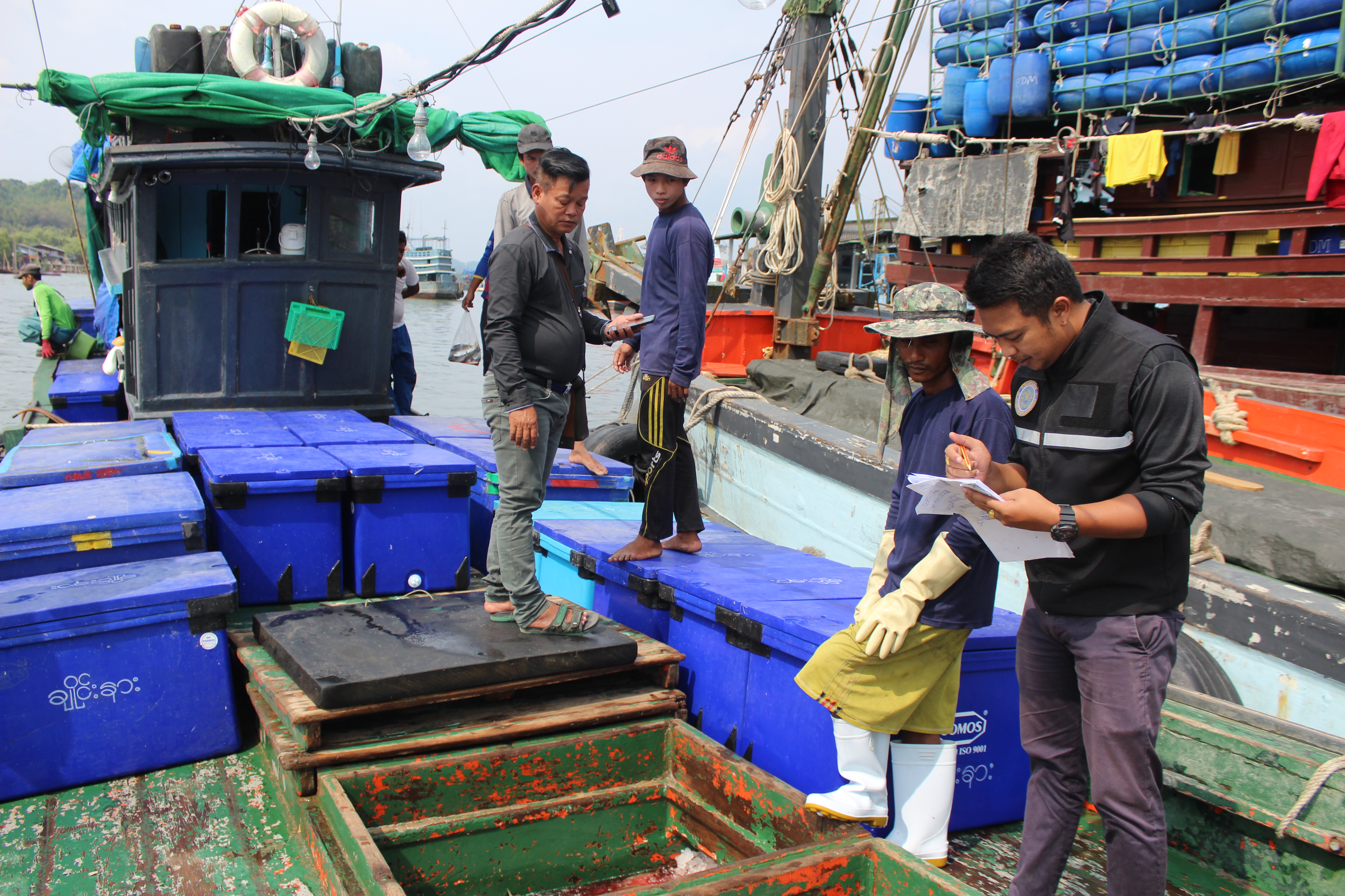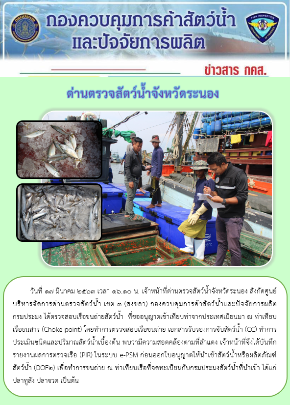 วันที่ 17 มีนาคม 2563 เวลา 16.10 น. เจ้าหน้าที่ด่านตรวจสัตว์น้ำจังหวัดระนอง สังกัดศูนย์บริหารจัดการด่านตรวจสัตว์น้ำ เขต 3 (สงขลา) กองควบคุมการค้าสัตว์น้ำและปัจจัยการผลิต กรมประมง ได้ตรวจสอบเรือขนถ่ายสัตว์น้ำ ที่ขออนุญาตเข้าเทียบท่าจากประเทศเมียนมา ณ ท่าเทียบเรือธนสาร (Choke point) โดยทำการตรวจสอบเรือขนถ่าย เอกสารรับรองการจับสัตว์น้ำ (CC) ทำการประเมินชนิดและปริมาณสัตว์น้ำเบื้องต้น พบว่ามีความสอดคล้องตามที่สำแดง เจ้าหน้าที่จึงได้บันทึกรายงานผลการตรวจเรือ (PIR) ในระบบ e-PSM ก่อนออกใบอนุญาตให้นำเข้าสัตว์น้ำหรือผลิตภัณฑ์สัตว์น้ำ (DOF2) เพื่อทำการขนถ่าย ณ ท่าเทียบเรือที่จดทะเบียนกับกรมประมงสัตว์น้ำที่นำเข้า ได้แก่ ปลาทูลัง ปลาจวด เป็นต้น