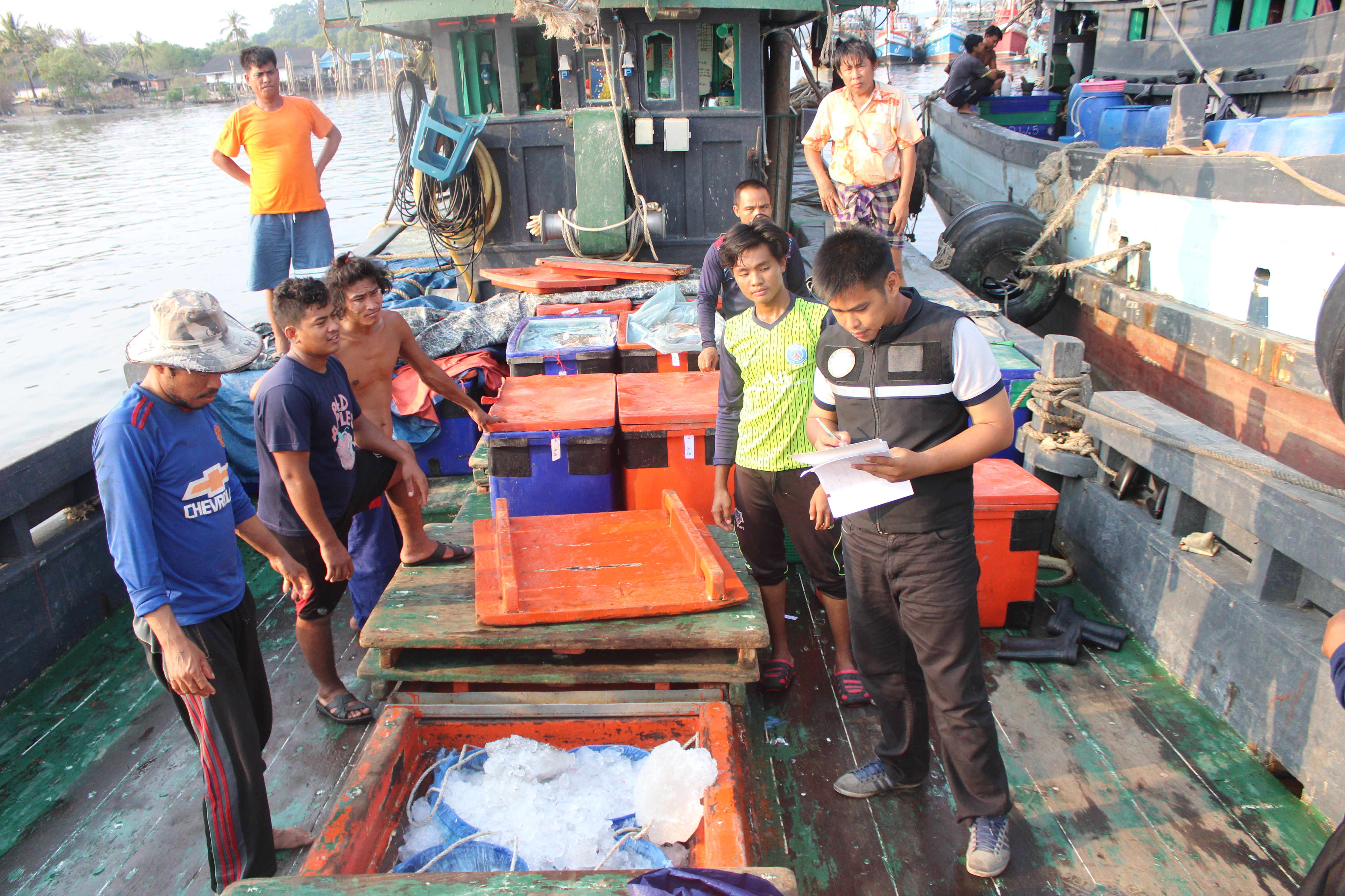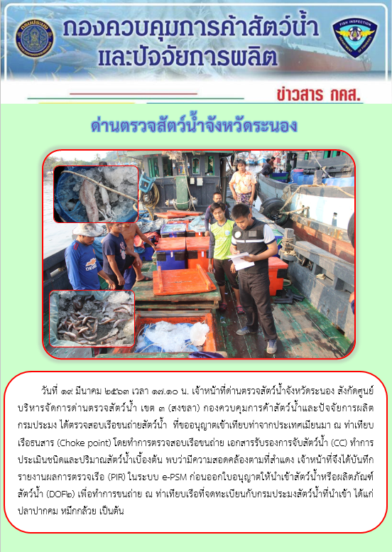 วันที่ 19 มีนาคม 2563 เวลา 17.10 น. เจ้าหน้าที่ด่านตรวจสัตว์น้ำจังหวัดระนอง สังกัดศูนย์บริหารจัดการด่านตรวจสัตว์น้ำ เขต 3 (สงขลา) กองควบคุมการค้าสัตว์น้ำและปัจจัยการผลิต กรมประมง ได้ตรวจสอบเรือขนถ่ายสัตว์น้ำ ที่ขออนุญาตเข้าเทียบท่าจากประเทศเมียนมา ณ ท่าเทียบเรือธนสาร (Choke point) โดยทำการตรวจสอบเรือขนถ่าย เอกสารรับรองการจับสัตว์น้ำ (CC) ทำการประเมินชนิดและปริมาณสัตว์น้ำเบื้องต้น พบว่ามีความสอดคล้องตามที่สำแดง เจ้าหน้าที่จึงได้บันทึกรายงานผลการตรวจเรือ (PIR) ในระบบ e-PSM ก่อนออกใบอนุญาตให้นำเข้าสัตว์น้ำหรือผลิตภัณฑ์สัตว์น้ำ (DOF2) เพื่อทำการขนถ่าย ณ ท่าเทียบเรือที่จดทะเบียนกับกรมประมงสัตว์น้ำที่นำเข้า ได้แก่ ปลาปากคม หมึกกล้วย เป็นต้น