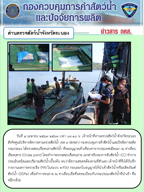 วันที่ 4 เมษายน 2563 2563 เวลา 09.10 น. เจ้าหน้าที่ด่านตรวจสัตว์น้ำจังหวัดระนอง สังกัดศูนย์บริหารจัดการด่านตรวจสัตว์น้ำ เขต 3 (สงขลา) กองควบคุมการค้าสัตว์น้ำและปัจจัยการผลิต กรมประมง ได้ตรวจสอบเรือขนถ่ายสัตว์น้ำ ที่ขออนุญาตเข้าเทียบท่าจากประเทศเมียนมา ณ ท่าเทียบเรือธนสาร (Choke point) โดยทำการตรวจสอบเรือขนถ่าย เอกสารรับรองการจับสัตว์น้ำ (CC) ทำการประเมินชนิดและปริมาณสัตว์น้ำเบื้องต้น พบว่ามีความสอดคล้องตามที่สำแดง เจ้าหน้าที่จึงได้บันทึกรายงานผลการตรวจเรือ (PIR) ในระบบ e-PSM ก่อนออกใบอนุญาตให้นำเข้าสัตว์น้ำหรือผลิตภัณฑ์สัตว์น้ำ (DOF2) เพื่อทำการขนถ่าย ณ ท่าเทียบเรือที่จดทะเบียนกับกรมประมงสัตว์น้ำที่นำเข้า คือ หมึกกล้วย