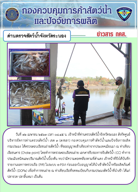 วันที่ 12 เมษายน 2563 เวลา 08.45 น. เจ้าหน้าที่ด่านตรวจสัตว์น้ำจังหวัดระนอง สังกัดศูนย์บริหารจัดการด่านตรวจสัตว์น้ำ เขต 3 (สงขลา) กองควบคุมการค้าสัตว์น้ำและปัจจัยการผลิต กรมประมง ได้ตรวจสอบเรือขนถ่ายสัตว์น้ำ ที่ขออนุญาตเข้าเทียบท่าจากประเทศเมียนมา ณ ท่าเทียบเรือธนสาร (Choke point) โดยทำการตรวจสอบเรือขนถ่าย เอกสารรับรองการจับสัตว์น้ำ (CC) ทำการประเมินชนิดและปริมาณสัตว์น้ำเบื้องต้น พบว่ามีความสอดคล้องตามที่สำแดง เจ้าหน้าที่จึงได้บันทึกรายงานผลการตรวจเรือ (PIR) ในระบบ e-PSM ก่อนออกใบอนุญาตให้นำเข้าสัตว์น้ำหรือผลิตภัณฑ์สัตว์น้ำ (DOF2) เพื่อทำการขนถ่าย ณ ท่าเทียบเรือที่จดทะเบียนกับกรมประมงสัตว์น้ำที่นำเข้า ได้แก่ ปลาจวด ปลาลิ้นหมา เป็นต้น