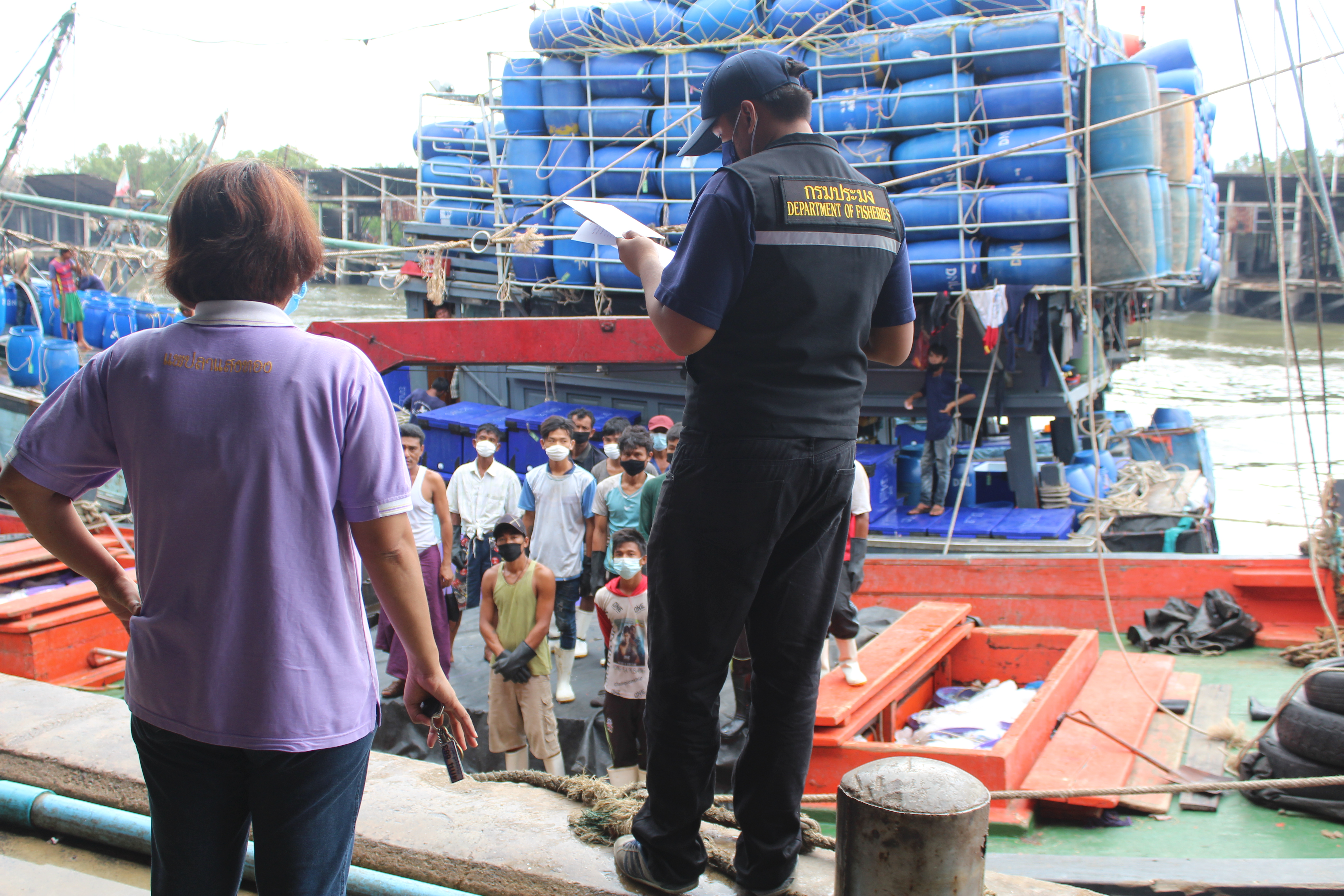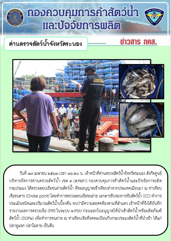 วันที่ 17 เมษายน 2563 เวลา 16.20 น. เจ้าหน้าที่ด่านตรวจสัตว์น้ำจังหวัดระนอง สังกัดศูนย์บริหารจัดการด่านตรวจสัตว์น้ำ เขต 3 (สงขลา) กองควบคุมการค้าสัตว์น้ำและปัจจัยการผลิต กรมประมง ได้ตรวจสอบเรือขนถ่ายสัตว์น้ำ ที่ขออนุญาตเข้าเทียบท่าจากประเทศเมียนมา ณ ท่าเทียบเรือธนสาร (Choke point) โดยทำการตรวจสอบเรือขนถ่าย เอกสารรับรองการจับสัตว์น้ำ (CC) ทำการประเมินชนิดและปริมาณสัตว์น้ำเบื้องต้น พบว่ามีความสอดคล้องตามที่สำแดง เจ้าหน้าที่จึงได้บันทึกรายงานผลการตรวจเรือ (PIR) ในระบบ e-PSM ก่อนออกใบอนุญาตให้นำเข้าสัตว์น้ำหรือผลิตภัณฑ์สัตว์น้ำ (DOF2) เพื่อทำการขนถ่าย ณ ท่าเทียบเรือที่จดทะเบียนกับกรมประมงสัตว์น้ำที่นำเข้า ได้แก่ ปลาทูแขก ปลาโอลาย เป็นต้น