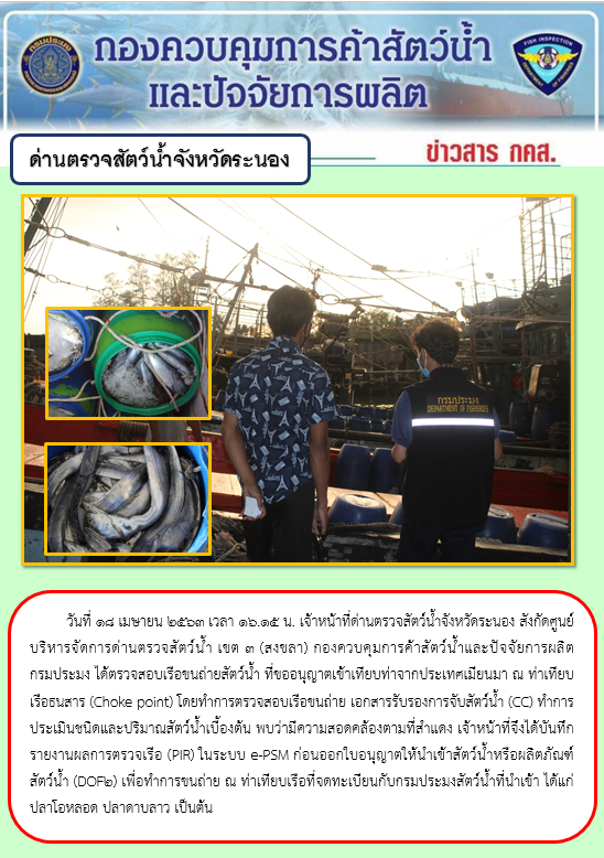 วันที่ 18 เมษายน 2563 เวลา 16.15 น. เจ้าหน้าที่ด่านตรวจสัตว์น้ำจังหวัดระนอง สังกัดศูนย์บริหารจัดการด่านตรวจสัตว์น้ำ เขต 3 (สงขลา) กองควบคุมการค้าสัตว์น้ำและปัจจัยการผลิต กรมประมง ได้ตรวจสอบเรือขนถ่ายสัตว์น้ำ ที่ขออนุญาตเข้าเทียบท่าจากประเทศเมียนมา ณ ท่าเทียบเรือธนสาร (Choke point) โดยทำการตรวจสอบเรือขนถ่าย เอกสารรับรองการจับสัตว์น้ำ (CC) ทำการประเมินชนิดและปริมาณสัตว์น้ำเบื้องต้น พบว่ามีความสอดคล้องตามที่สำแดง เจ้าหน้าที่จึงได้บันทึกรายงานผลการตรวจเรือ (PIR) ในระบบ e-PSM ก่อนออกใบอนุญาตให้นำเข้าสัตว์น้ำหรือผลิตภัณฑ์สัตว์น้ำ (DOF2) เพื่อทำการขนถ่าย ณ ท่าเทียบเรือที่จดทะเบียนกับกรมประมงสัตว์น้ำที่นำเข้า ได้แก่ ปลาโอหลอด ปลาดาบลาว เป็นต้น