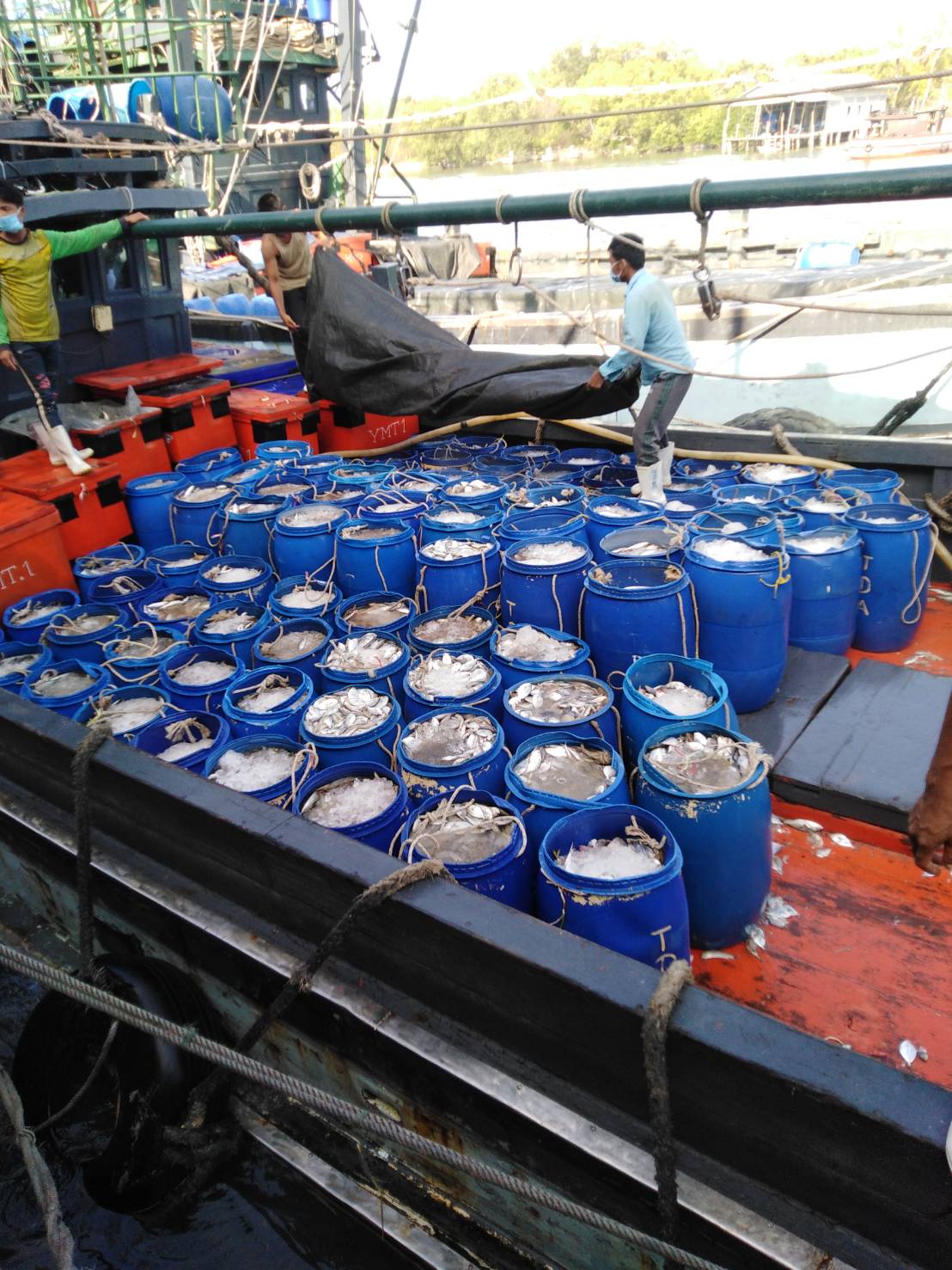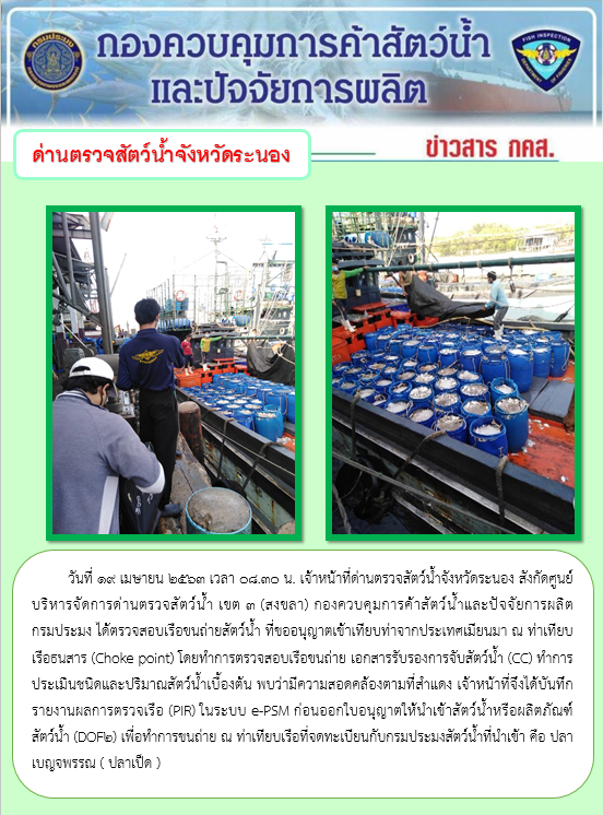 วันที่ 19 เมษายน 2563 เวลา 08.30 น. เจ้าหน้าที่ด่านตรวจสัตว์น้ำจังหวัดระนอง สังกัดศูนย์บริหารจัดการด่านตรวจสัตว์น้ำ เขต 3 (สงขลา) กองควบคุมการค้าสัตว์น้ำและปัจจัยการผลิต กรมประมง ได้ตรวจสอบเรือขนถ่ายสัตว์น้ำ ที่ขออนุญาตเข้าเทียบท่าจากประเทศเมียนมา ณ ท่าเทียบเรือธนสาร (Choke point) โดยทำการตรวจสอบเรือขนถ่าย เอกสารรับรองการจับสัตว์น้ำ (CC) ทำการประเมินชนิดและปริมาณสัตว์น้ำเบื้องต้น พบว่ามีความสอดคล้องตามที่สำแดง เจ้าหน้าที่จึงได้บันทึกรายงานผลการตรวจเรือ (PIR) ในระบบ e-PSM ก่อนออกใบอนุญาตให้นำเข้าสัตว์น้ำหรือผลิตภัณฑ์สัตว์น้ำ (DOF2) เพื่อทำการขนถ่าย ณ ท่าเทียบเรือที่จดทะเบียนกับกรมประมงสัตว์น้ำที่นำเข้า คือ ปลาเบญจพรรณ ( ปลาเป็ด )