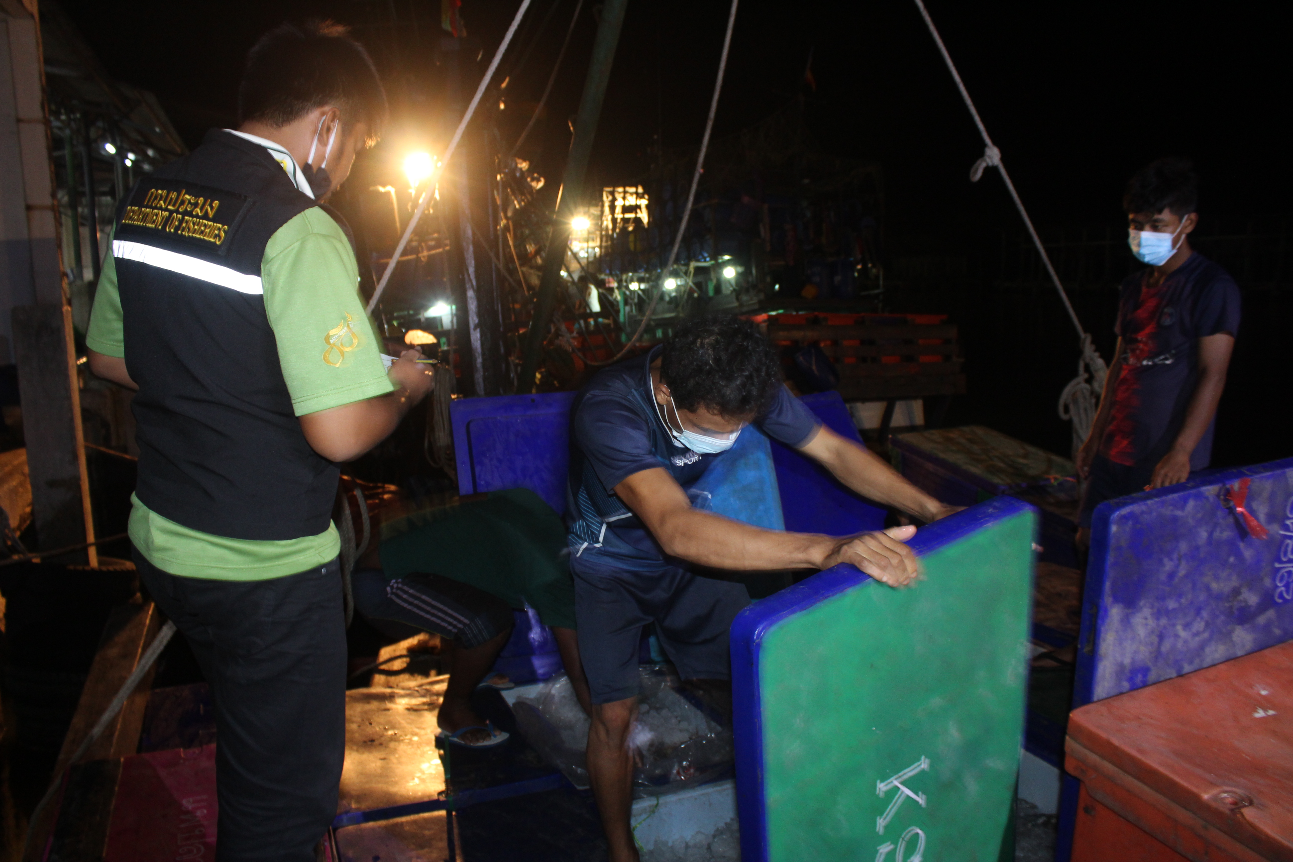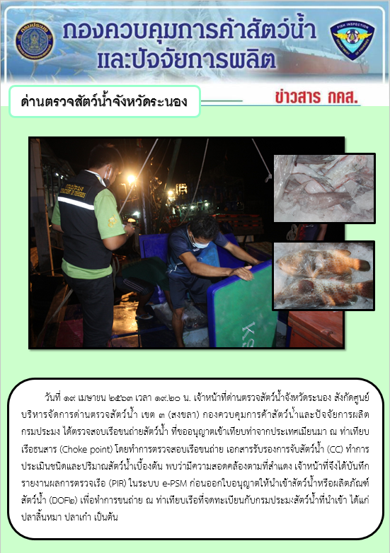 วันที่ 19 เมษายน 2563 เวลา 19.20 น. เจ้าหน้าที่ด่านตรวจสัตว์น้ำจังหวัดระนอง สังกัดศูนย์บริหารจัดการด่านตรวจสัตว์น้ำ เขต 3 (สงขลา) กองควบคุมการค้าสัตว์น้ำและปัจจัยการผลิต กรมประมง ได้ตรวจสอบเรือขนถ่ายสัตว์น้ำ ที่ขออนุญาตเข้าเทียบท่าจากประเทศเมียนมา ณ ท่าเทียบเรือธนสาร (Choke point) โดยทำการตรวจสอบเรือขนถ่าย เอกสารรับรองการจับสัตว์น้ำ (CC) ทำการประเมินชนิดและปริมาณสัตว์น้ำเบื้องต้น พบว่ามีความสอดคล้องตามที่สำแดง เจ้าหน้าที่จึงได้บันทึกรายงานผลการตรวจเรือ (PIR) ในระบบ e-PSM ก่อนออกใบอนุญาตให้นำเข้าสัตว์น้ำหรือผลิตภัณฑ์สัตว์น้ำ (DOF2) เพื่อทำการขนถ่าย ณ ท่าเทียบเรือที่จดทะเบียนกับกรมประมงสัตว์น้ำที่นำเข้า ได้แก่ ปลาลิ้นหมา ปลาเก๋า เป็นต้น