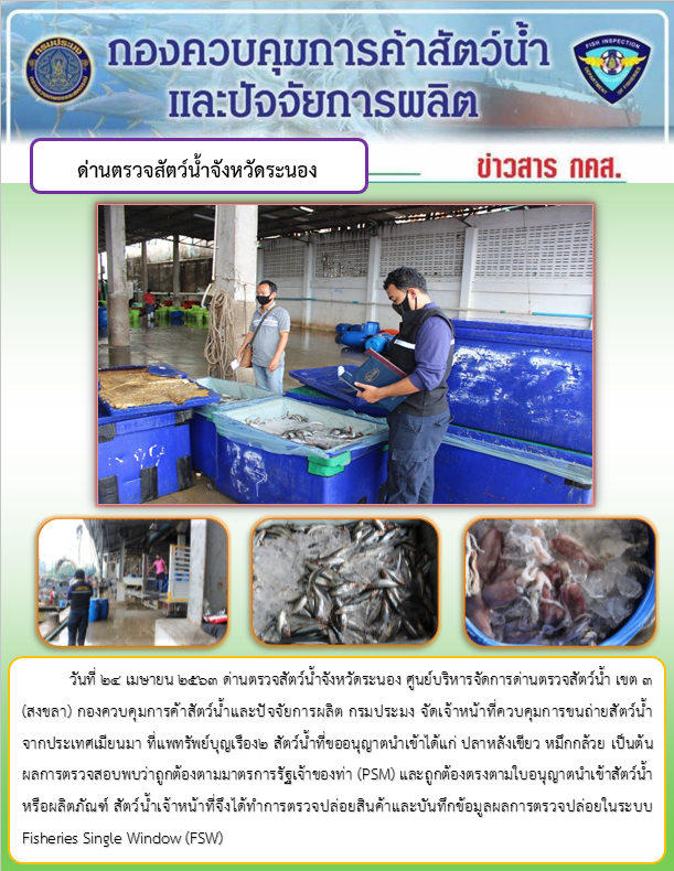 วันที่ 24 เมษายน 2563 ด่านตรวจสัตว์น้ำจังหวัดระนอง ศูนย์บริหารจัดการด่านตรวจสัตว์น้ำ เขต 3 (สงขลา) กองควบคุมการค้าสัตว์น้ำและปัจจัยการผลิต กรมประมง จัดเจ้าหน้าที่ควบคุมการขนถ่ายสัตว์น้ำจากประเทศเมียนมา ที่แพทรัพย์บุญเรือง2 สัตว์น้ำที่ขออนุญาตนำเข้าได้แก่ ปลาหลังเขียว หมึกกล้วย เป็นต้น ผลการตรวจสอบพบว่าถูกต้องตามมาตรการรัฐเจ้าของท่า (PSM) และถูกต้องตรงตามใบอนุญาตนำเข้าสัตว์น้ำหรือผลิตภัณฑ์ สัตว์น้ำเจ้าหน้าที่จึงได้ทำการตรวจปล่อยสินค้าและบันทึกข้อมูลผลการตรวจปล่อยในระบบ Fisheries Single Window (FSW)