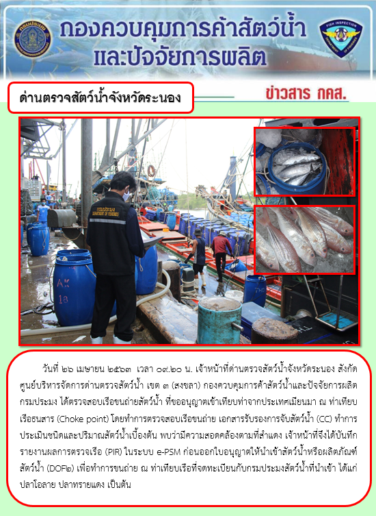 วันที่ 26 เมษายน 2563  เวลา 09.20 น. เจ้าหน้าที่ด่านตรวจสัตว์น้ำจังหวัดระนอง สังกัดศูนย์บริหารจัดการด่านตรวจสัตว์น้ำ เขต 3 (สงขลา) กองควบคุมการค้าสัตว์น้ำและปัจจัยการผลิตกรมประมง ได้ตรวจสอบเรือขนถ่ายสัตว์น้ำ ที่ขออนุญาตเข้าเทียบท่าจากประเทศเมียนมา ณ ท่าเทียบเรือธนสาร (Choke point) โดยทำการตรวจสอบเรือขนถ่าย เอกสารรับรองการจับสัตว์น้ำ (CC) ทำการประเมินชนิดและปริมาณสัตว์น้ำเบื้องต้น พบว่ามีความสอดคล้องตามที่สำแดง เจ้าหน้าที่จึงได้บันทึกรายงานผลการตรวจเรือ (PIR) ในระบบ e-PSM ก่อนออกใบอนุญาตให้นำเข้าสัตว์น้ำหรือผลิตภัณฑ์สัตว์น้ำ (DOF2) เพื่อทำการขนถ่าย ณ ท่าเทียบเรือที่จดทะเบียนกับกรมประมงสัตว์น้ำที่นำเข้า ได้แก่ ปลาโอลาย ปลาทรายแดง เป็นต้น