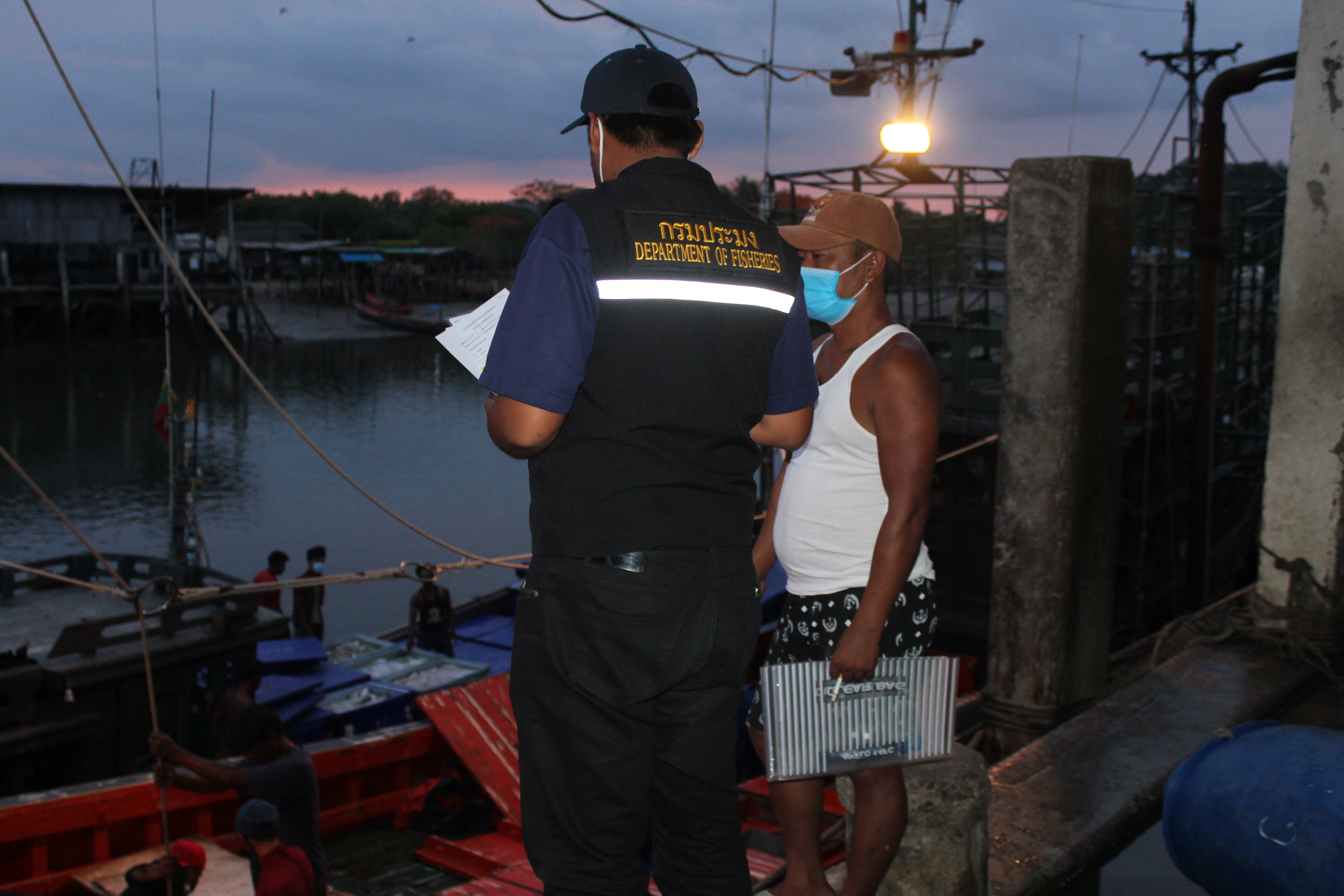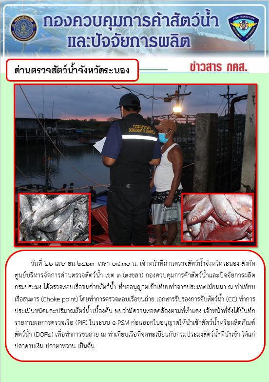 วันที่ 26 เมษายน 2563 เวลา 08.30 น. เจ้าหน้าที่ด่านตรวจสัตว์น้ำจังหวัดระนอง สังกัดศูนย์บริหารจัดการด่านตรวจสัตว์น้ำ เขต 3 (สงขลา) กองควบคุมการค้าสัตว์น้ำและปัจจัยการผลิต กรมประมง ได้ตรวจสอบเรือขนถ่ายสัตว์น้ำ ที่ขออนุญาตเข้าเทียบท่าจากประเทศเมียนมา ณ ท่าเทียบเรือธนสาร (Choke point) โดยทำการตรวจสอบเรือขนถ่าย เอกสารรับรองการจับสัตว์น้ำ (CC) ทำการประเมินชนิดและปริมาณสัตว์น้ำเบื้องต้น พบว่ามีความสอดคล้องตามที่สำแดง เจ้าหน้าที่จึงได้บันทึกรายงานผลการตรวจเรือ (PIR) ในระบบ e-PSM ก่อนออกใบอนุญาตให้นำเข้าสัตว์น้ำหรือผลิตภัณฑ์สัตว์น้ำ (DOF2) เพื่อทำการขนถ่าย ณ ท่าเทียบเรือที่จดทะเบียนกับกรมประมงสัตว์น้ำที่นำเข้า ได้แก่ ปลาดาบเงิน ปลาตาหวาน เป็นต้น