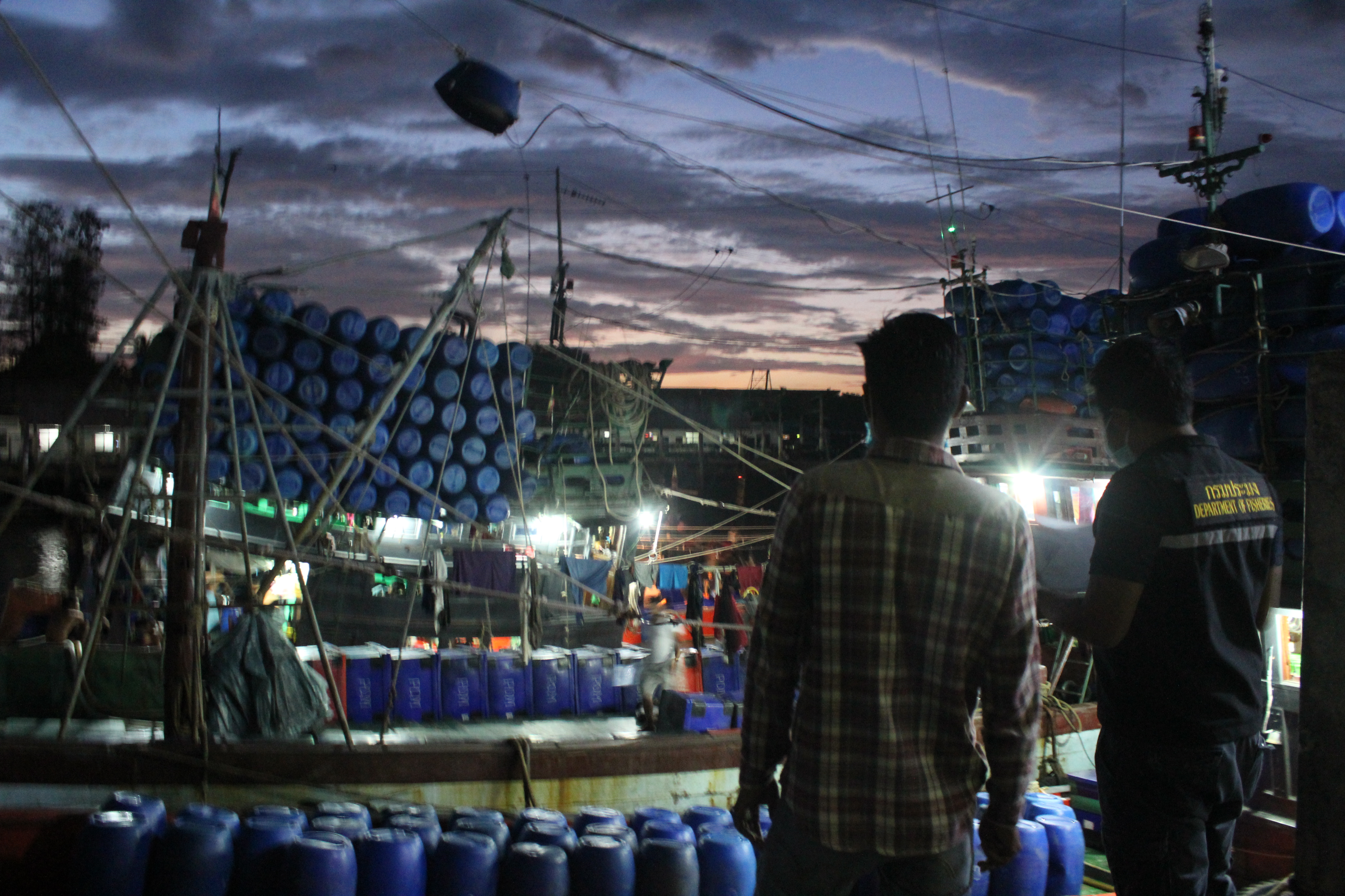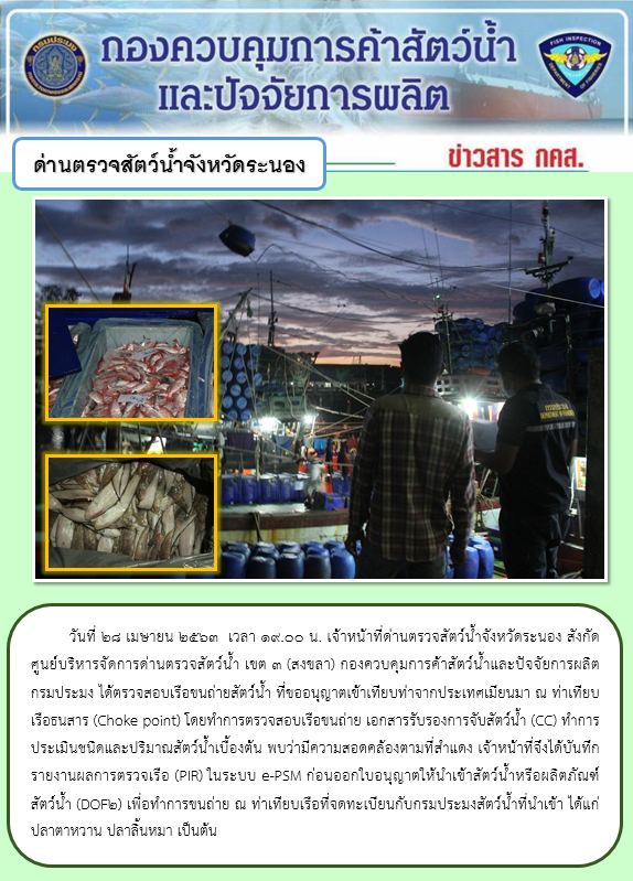 วันที่ 28 เมษายน 2563 เวลา 19.00 น. เจ้าหน้าที่ด่านตรวจสัตว์น้ำจังหวัดระนอง สังกัดศูนย์บริหารจัดการด่านตรวจสัตว์น้ำ เขต 3 (สงขลา) กองควบคุมการค้าสัตว์น้ำและปัจจัยการผลิต กรมประมง ได้ตรวจสอบเรือขนถ่ายสัตว์น้ำ ที่ขออนุญาตเข้าเทียบท่าจากประเทศเมียนมา ณ ท่าเทียบเรือธนสาร (Choke point) โดยทำการตรวจสอบเรือขนถ่าย เอกสารรับรองการจับสัตว์น้ำ (CC) ทำการประเมินชนิดและปริมาณสัตว์น้ำเบื้องต้น พบว่ามีความสอดคล้องตามที่สำแดง เจ้าหน้าที่จึงได้บันทึกรายงานผลการตรวจเรือ (PIR) ในระบบ e-PSM ก่อนออกใบอนุญาตให้นำเข้าสัตว์น้ำหรือผลิตภัณฑ์สัตว์น้ำ (DOF2) เพื่อทำการขนถ่าย ณ ท่าเทียบเรือที่จดทะเบียนกับกรมประมงสัตว์น้ำที่นำเข้า ได้แก่ ปลาตาหวาน ปลาลิ้นหมา เป็นต้น