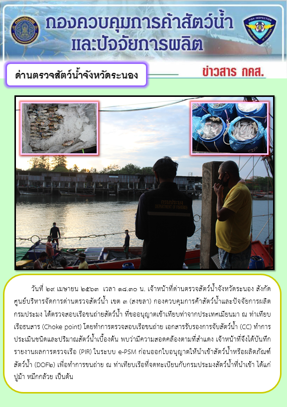 วันที่ 29 เมษายน 2563 เวลา 18.30 น. เจ้าหน้าที่ด่านตรวจสัตว์น้ำจังหวัดระนอง สังกัดศูนย์บริหารจัดการด่านตรวจสัตว์น้ำ เขต 3 (สงขลา) กองควบคุมการค้าสัตว์น้ำและปัจจัยการผลิต กรมประมง ได้ตรวจสอบเรือขนถ่ายสัตว์น้ำ ที่ขออนุญาตเข้าเทียบท่าจากประเทศเมียนมา ณ ท่าเทียบเรือธนสาร (Choke point) โดยทำการตรวจสอบเรือขนถ่าย เอกสารรับรองการจับสัตว์น้ำ (CC) ทำการประเมินชนิดและปริมาณสัตว์น้ำเบื้องต้น พบว่ามีความสอดคล้องตามที่สำแดง เจ้าหน้าที่จึงได้บันทึกรายงานผลการตรวจเรือ (PIR) ในระบบ e-PSM ก่อนออกใบอนุญาตให้นำเข้าสัตว์น้ำหรือผลิตภัณฑ์สัตว์น้ำ (DOF2) เพื่อทำการขนถ่าย ณ ท่าเทียบเรือที่จดทะเบียนกับกรมประมงสัตว์น้ำที่นำเข้า ได้แก่ ปูม้า หมึกกล้วย เป็นต้น