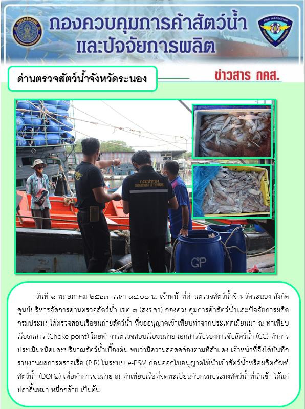 Choke point) โดยทำการตรวจสอบเรือขนถ่าย เอกสารรับรองการจับสัตว์น้ำ (CC) ทำการประเมินชนิดและปริมาณสัตว์น้ำเบื้องต้น พบว่ามีความสอดคล้องตามที่สำแดง เจ้าหน้าที่จึงได้บันทึกรายงานผลการตรวจเรือ (PIR) ในระบบ e-PSM ก่อนออกใบอนุญาตให้นำเข้าสัตว์น้ำหรือผลิตภัณฑ์สัตว์น้ำ (DOF2) เพื่อทำการขนถ่าย ณ ท่าเทียบเรือที่จดทะเบียนกับกรมประมงสัตว์น้ำที่นำเข้า ได้แก่   ปลาลิ้นหมา หมึกกล้วย เป็นต้น
