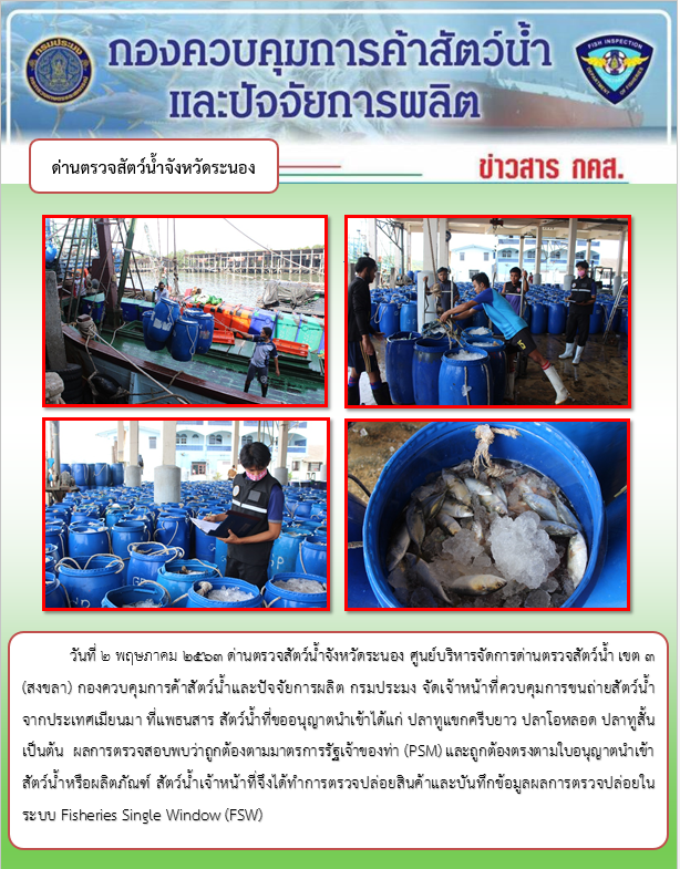 วันที่ 2 พฤษภาคม 2563 ด่านตรวจสัตว์น้ำจังหวัดระนอง ศูนย์บริหารจัดการด่านตรวจสัตว์น้ำ เขต 3 (สงขลา) กองควบคุมการค้าสัตว์น้ำและปัจจัยการผลิต กรมประมง จัดเจ้าหน้าที่ควบคุมการขนถ่ายสัตว์น้ำ จากประเทศเมียนมา ที่แพธนสาร สัตว์น้ำที่ขออนุญาตนำเข้าได้แก่ ปลาทูแขกครีบยาว ปลาโอหลอด ปลาทูสั้นเป็นต้น ผลการตรวจสอบพบว่าถูกต้องตามมาตรการรัฐเจ้าของท่า (PSM) และถูกต้องตรงตามใบอนุญาตนำเข้าสัตว์น้ำหรือผลิตภัณฑ์ สัตว์น้ำเจ้าหน้าที่จึงได้ทำการตรวจปล่อยสินค้าและบันทึกข้อมูลผลการตรวจปล่อยในระบบ Fisheries Single Window (FSW)