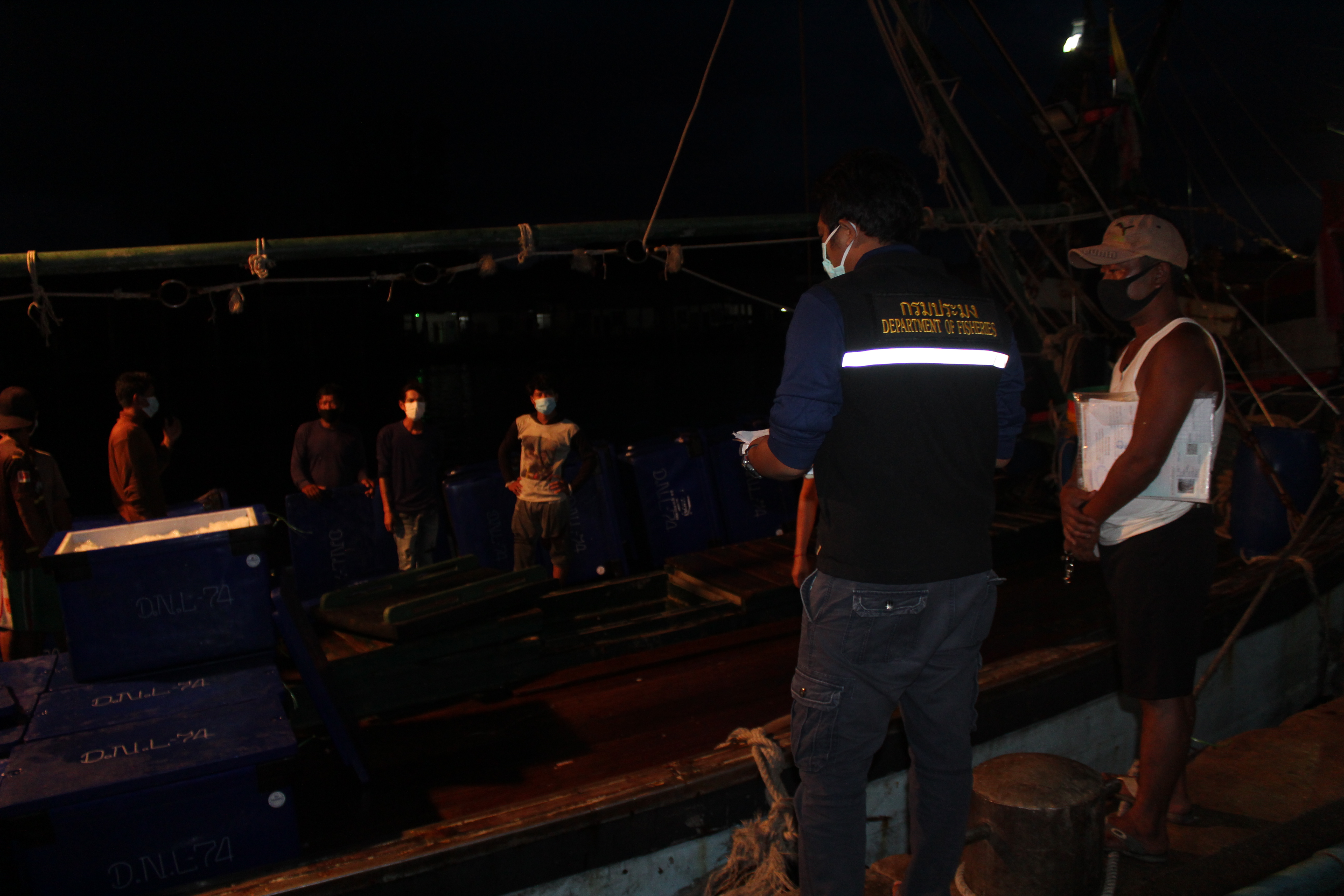 วันที่ 4 พฤษภาคม 2563 เวลา 19.50 น. เจ้าหน้าที่ด่านตรวจสัตว์น้ำจังหวัดระนอง สังกัดศูนย์บริหารจัดการด่านตรวจสัตว์น้ำ เขต 3 (สงขลา) กองควบคุมการค้าสัตว์น้ำและปัจจัยการผลิต กรมประมง ได้ตรวจสอบเรือขนถ่ายสัตว์น้ำ ที่ขออนุญาตเข้าเทียบท่าจากประเทศเมียนมา ณ ท่าเทียบเรือธนสาร (Choke point) โดยทำการตรวจสอบเรือขนถ่าย เอกสารรับรองการจับสัตว์น้ำ (CC) ทำการประเมินชนิดและปริมาณสัตว์น้ำเบื้องต้น พบว่ามีความสอดคล้องตามที่สำแดง เจ้าหน้าที่จึงได้บันทึกรายงานผลการตรวจเรือ (PIR) ในระบบ e-PSM ก่อนออกใบอนุญาตให้นำเข้าสัตว์น้ำหรือผลิตภัณฑ์สัตว์น้ำ (DOF2) เพื่อทำการขนถ่าย ณ ท่าเทียบเรือที่จดทะเบียนกับกรมประมงสัตว์น้ำที่นำเข้า ได้แก่ ปลาปากคม หมึกสาย เป็นต้น