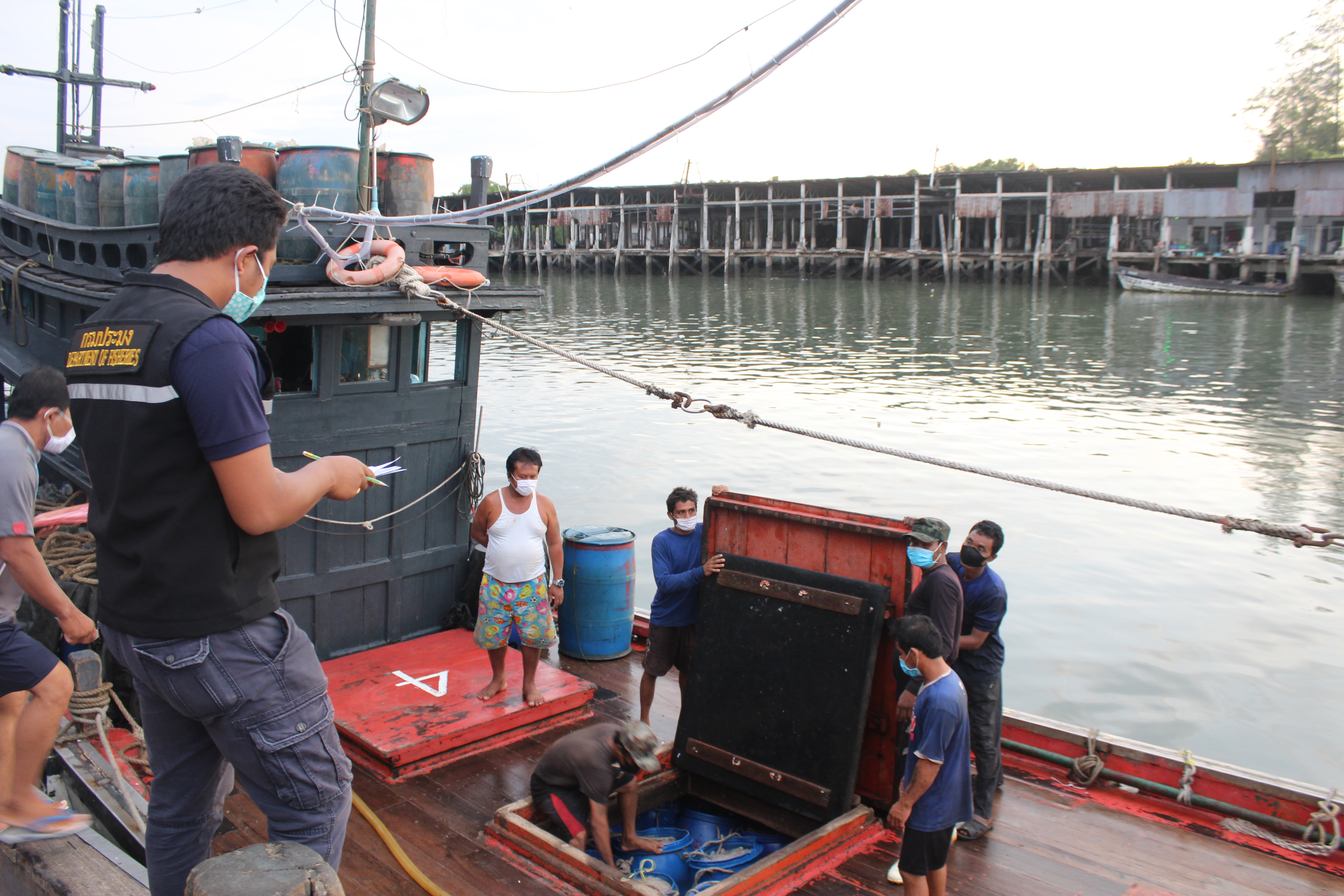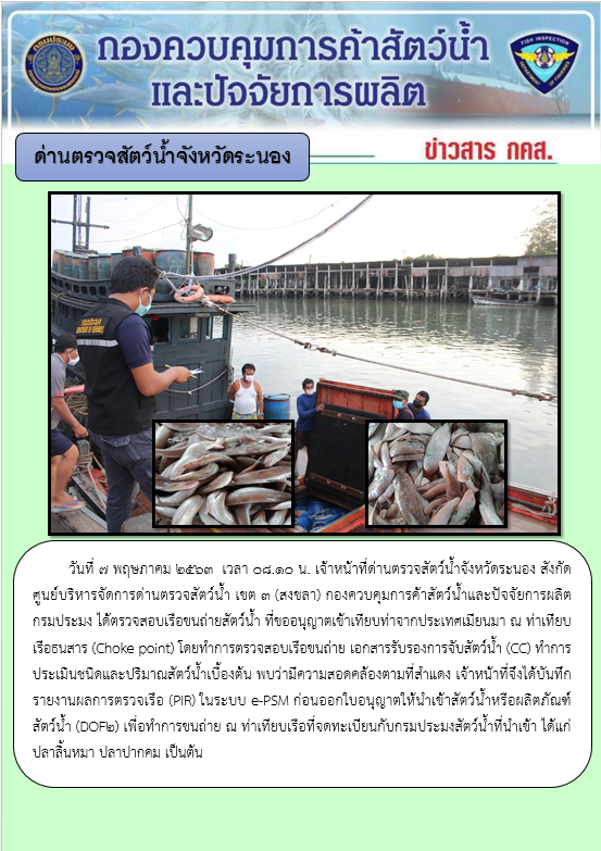 วันที่ 7 พฤษภาคม 2563 เวลา 08.10 น. เจ้าหน้าที่ด่านตรวจสัตว์น้ำจังหวัดระนอง สังกัดศูนย์บริหารจัดการด่านตรวจสัตว์น้ำ เขต 3 (สงขลา) กองควบคุมการค้าสัตว์น้ำและปัจจัยการผลิต กรมประมง ได้ตรวจสอบเรือขนถ่ายสัตว์น้ำ ที่ขออนุญาตเข้าเทียบท่าจากประเทศเมียนมา ณ ท่าเทียบเรือธนสาร (Choke point) โดยทำการตรวจสอบเรือขนถ่าย เอกสารรับรองการจับสัตว์น้ำ (CC) ทำการประเมินชนิดและปริมาณสัตว์น้ำเบื้องต้น พบว่ามีความสอดคล้องตามที่สำแดง เจ้าหน้าที่จึงได้บันทึกรายงานผลการตรวจเรือ (PIR) ในระบบ e-PSM ก่อนออกใบอนุญาตให้นำเข้าสัตว์น้ำหรือผลิตภัณฑ์สัตว์น้ำ (DOF2) เพื่อทำการขนถ่าย ณ ท่าเทียบเรือที่จดทะเบียนกับกรมประมงสัตว์น้ำที่นำเข้า ได้แก่ ปลาลิ้นหมา ปลาปากคม เป็นต้น