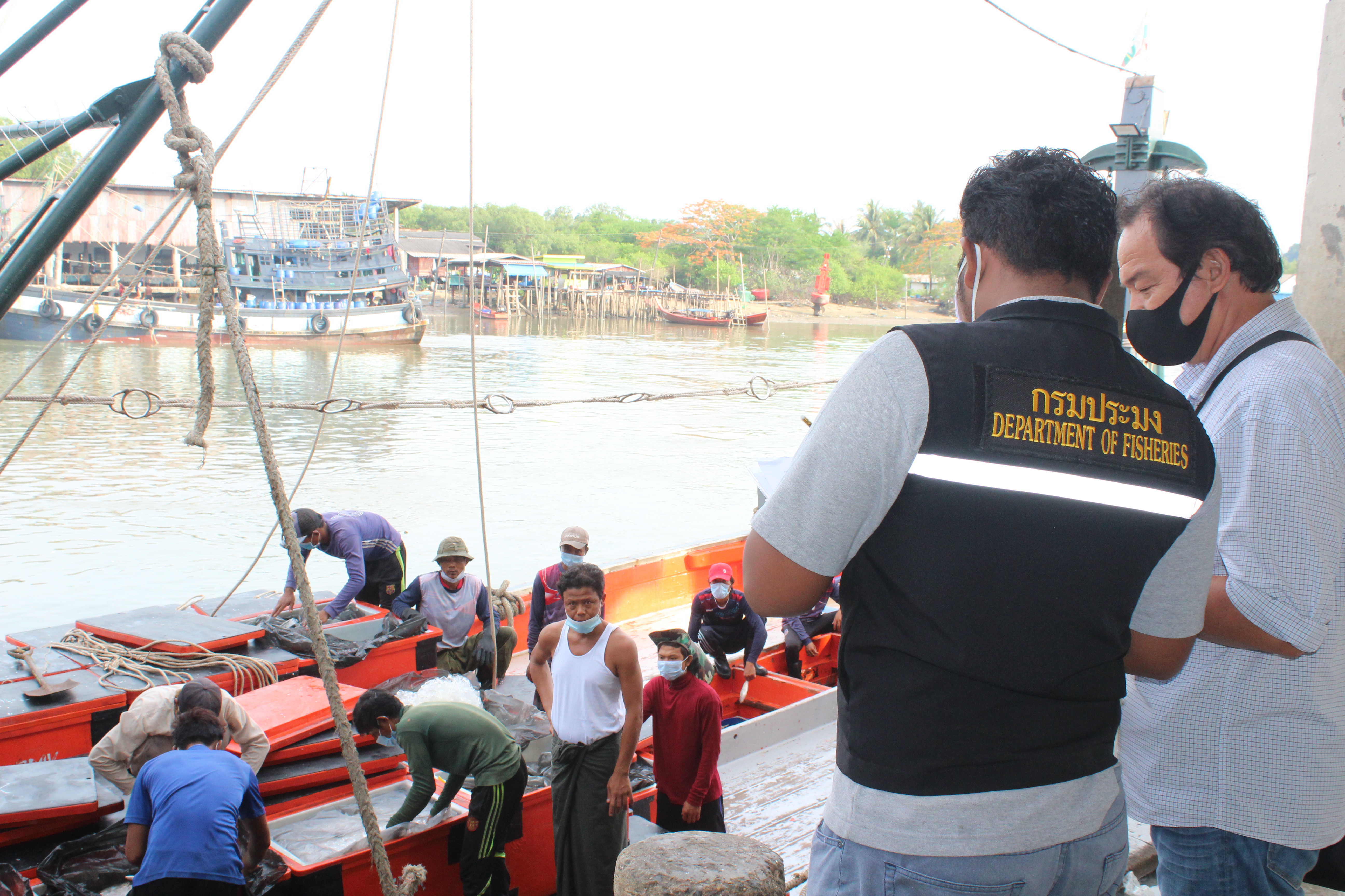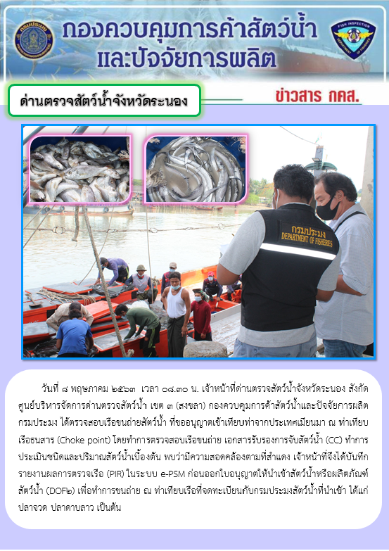 วันที่ 8 พฤษภาคม 2563 เวลา 08.30 น. เจ้าหน้าที่ด่านตรวจสัตว์น้ำจังหวัดระนอง สังกัดศูนย์บริหารจัดการด่านตรวจสัตว์น้ำ เขต 3 (สงขลา) กองควบคุมการค้าสัตว์น้ำและปัจจัยการผลิต กรมประมง ได้ตรวจสอบเรือขนถ่ายสัตว์น้ำ ที่ขออนุญาตเข้าเทียบท่าจากประเทศเมียนมา ณ ท่าเทียบเรือธนสาร (Choke point) โดยทำการตรวจสอบเรือขนถ่าย เอกสารรับรองการจับสัตว์น้ำ (CC) ทำการประเมินชนิดและปริมาณสัตว์น้ำเบื้องต้น พบว่ามีความสอดคล้องตามที่สำแดง เจ้าหน้าที่จึงได้บันทึกรายงานผลการตรวจเรือ (PIR) ในระบบ e-PSM ก่อนออกใบอนุญาตให้นำเข้าสัตว์น้ำหรือผลิตภัณฑ์สัตว์น้ำ (DOF2) เพื่อทำการขนถ่าย ณ ท่าเทียบเรือที่จดทะเบียนกับกรมประมงสัตว์น้ำที่นำเข้า ได้แก่ ปลาจวด ปลาดาบลาว เป็นต้น