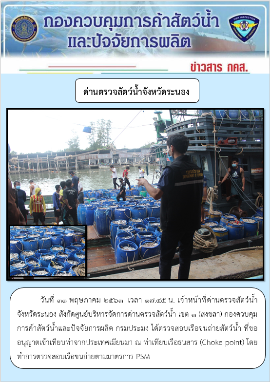 วันที่ 31 พฤษภาคม 2563 เวลา 17.45 น. เจ้าหน้าที่ด่านตรวจสัตว์น้ำจังหวัดระนอง สังกัดศูนย์บริหารจัดการด่านตรวจสัตว์น้ำ เขต 3 (สงขลา) กองควบคุมการค้าสัตว์น้ำและปัจจัยการผลิต กรมประมง ได้ตรวจสอบเรือขนถ่ายสัตว์น้ำ ที่ขออนุญาตเข้าเทียบท่าจากประเทศเมียนมา ณ ท่าเทียบเรือธนสาร (Choke point) โดยทำการตรวจสอบเรือขนถ่ายตามมาตรการ PSMวันที่ 31 พฤษภาคม 2563 เวลา 17.45 น. เจ้าหน้าที่ด่านตรวจสัตว์น้ำจังหวัดระนอง สังกัดศูนย์บริหารจัดการด่านตรวจสัตว์น้ำ เขต 3 (สงขลา) กองควบคุมการค้าสัตว์น้ำและปัจจัยการผลิต กรมประมง ได้ตรวจสอบเรือขนถ่ายสัตว์น้ำ ที่ขออนุญาตเข้าเทียบท่าจากประเทศเมียนมา ณ ท่าเทียบเรือธนสาร (Choke point) โดยทำการตรวจสอบเรือขนถ่ายตามมาตรการ PSM