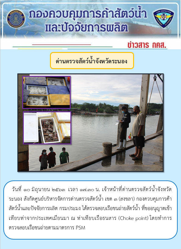 วันที่ 10 มิถุนายน 2563 เวลา 17.30 น. เจ้าหน้าที่ด่านตรวจสัตว์น้ำจังหวัดระนอง สังกัดศูนย์บริหารจัดการด่านตรวจสัตว์น้ำ เขต 3 (สงขลา) กองควบคุมการค้าสัตว์น้ำและปัจจัยการผลิต กรมประมง ได้ตรวจสอบเรือขนถ่ายสัตว์น้ำ ที่ขออนุญาตเข้าเทียบท่าจากประเทศเมียนมา ณ ท่าเทียบเรือธนสาร (Choke point) โดยทำการตรวจสอบเรือขนถ่ายตามมาตรการ PSM