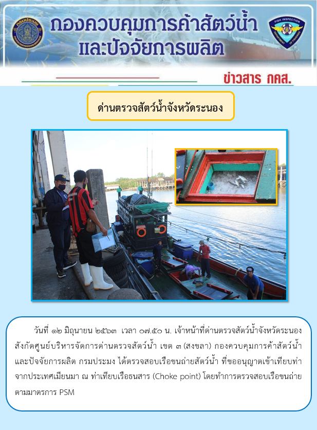 วันที่ 12 มิถุนายน 2563 เวลา 07.50 น. เจ้าหน้าที่ด่านตรวจสัตว์น้ำจังหวัดระนอง สังกัดศูนย์บริหารจัดการด่านตรวจสัตว์น้ำ เขต 3 (สงขลา) กองควบคุมการค้าสัตว์น้ำและปัจจัยการผลิต กรมประมง ได้ตรวจสอบเรือขนถ่ายสัตว์น้ำ ที่ขออนุญาตเข้าเทียบท่าจากประเทศเมียนมา ณ ท่าเทียบเรือธนสาร (Choke point) โดยทำการตรวจสอบเรือขนถ่ายตามมาตรการ PSM