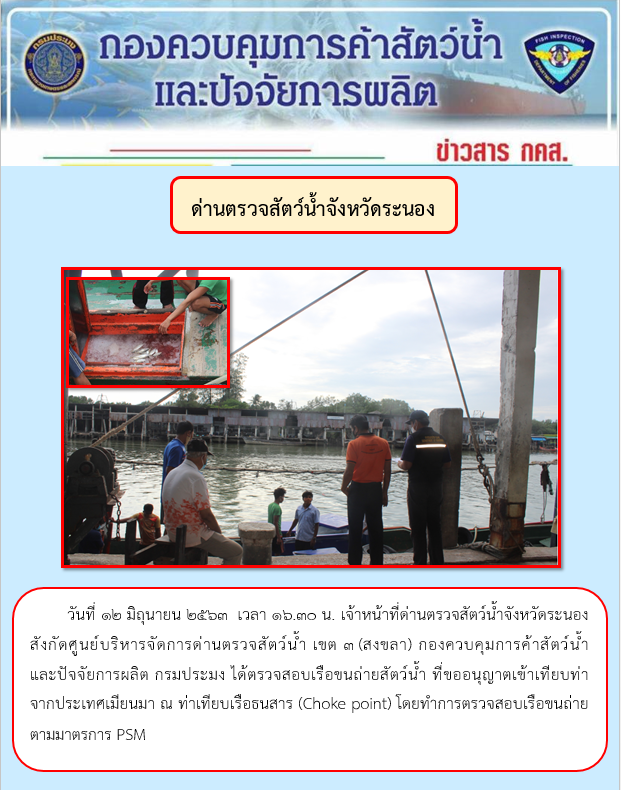 วันที่ 12 มิถุนายน 2563 เวลา 16.30 น. เจ้าหน้าที่ด่านตรวจสัตว์น้ำจังหวัดระนอง สังกัดศูนย์บริหารจัดการด่านตรวจสัตว์น้ำ เขต 3 (สงขลา) กองควบคุมการค้าสัตว์น้ำ และปัจจัยการผลิต กรมประมง ได้ตรวจสอบเรือขนถ่ายสัตว์น้ำ ที่ขออนุญาตเข้าเทียบท่า จากประเทศเมียนมา ณ ท่าเทียบเรือธนสาร (Choke point) โดยทำการตรวจสอบเรือขนถ่ายตามมาตรการ PSM