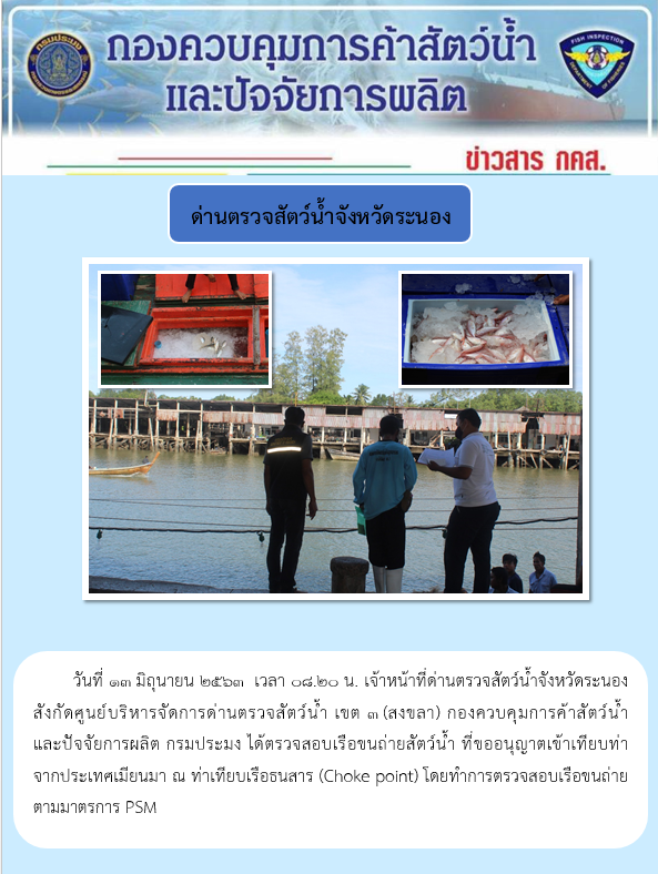 วันที่ 13 มิถุนายน 2563 เวลา 08.20 น. เจ้าหน้าที่ด่านตรวจสัตว์น้ำจังหวัดระนอง สังกัดศูนย์บริหารจัดการด่านตรวจสัตว์น้ำ เขต 3 (สงขลา) กองควบคุมการค้าสัตว์น้ำ และปัจจัยการผลิต กรมประมง ได้ตรวจสอบเรือขนถ่ายสัตว์น้ำ ที่ขออนุญาตเข้าเทียบท่า จากประเทศเมียนมา ณ ท่าเทียบเรือธนสาร (Choke point) โดยทำการตรวจสอบเรือขนถ่ายตามมาตรการ PSM