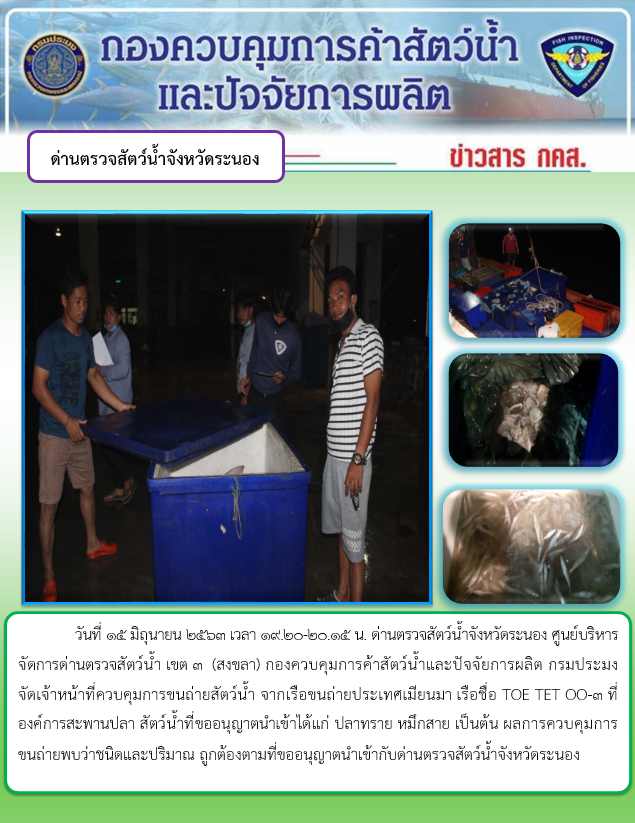 วันที่ 15 มิถุนายน 2563 เวลา 19.20-20.15 น. ด่านตรวจสัตว์น้ำจังหวัดระนอง ศูนย์บริหารจัดการด่านตรวจสัตว์น้ำ เขต 3 (สงขลา) กองควบคุมการค้าสัตว์น้ำและปัจจัยการผลิต กรมประมง จัดเจ้าหน้าที่ควบคุมการขนถ่ายสัตว์น้ำ จากเรือขนถ่ายประเทศเมียนมา เรือชื่อ TOE TET OO-3 ที่องค์การสะพานปลา สัตว์น้ำที่ขออนุญาตนำเข้าได้แก่ ปลาทราย หมึกสาย เป็นต้น ผลการควบคุมการขนถ่ายพบว่าชนิดและปริมาณ ถูกต้องตามที่ขออนุญาตนำเข้ากับด่านตรวจสัตว์น้ำจังหวัดระนอง