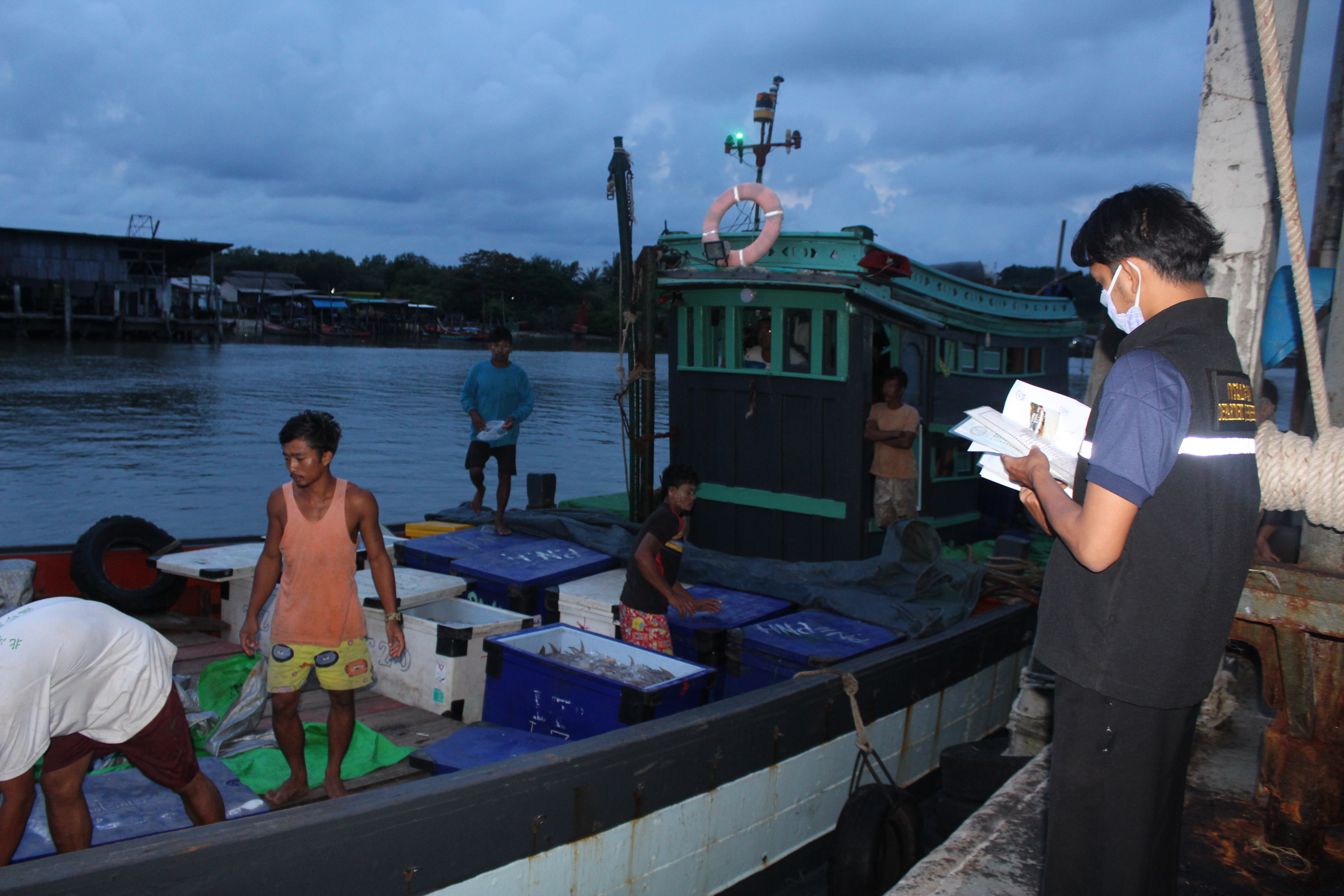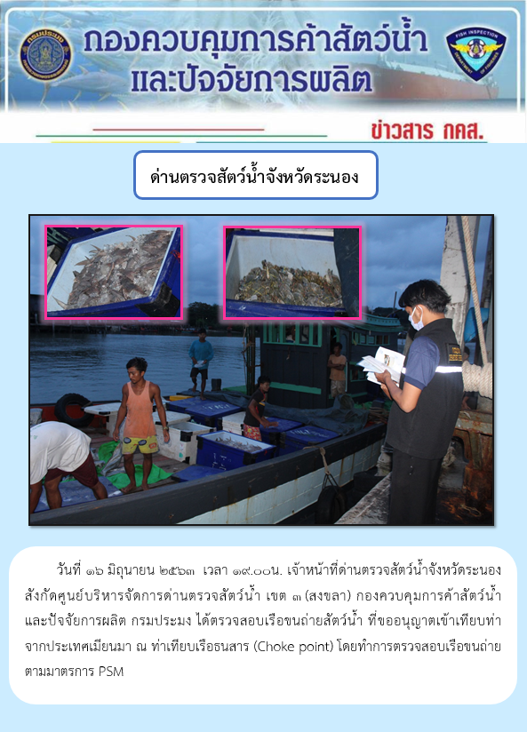 วันที่ 16 มิถุนายน 2563 เวลา 19.00น. เจ้าหน้าที่ด่านตรวจสัตว์น้ำจังหวัดระนอง สังกัดศูนย์บริหารจัดการด่านตรวจสัตว์น้ำ เขต 3 (สงขลา) กองควบคุมการค้าสัตว์น้ำและปัจจัยการผลิต กรมประมง ได้ตรวจสอบเรือขนถ่ายสัตว์น้ำ ที่ขออนุญาตเข้าเทียบท่าจากประเทศเมียนมา ณ ท่าเทียบเรือธนสาร (Choke point) โดยทำการตรวจสอบเรือขนถ่ายตามมาตรการ PSM