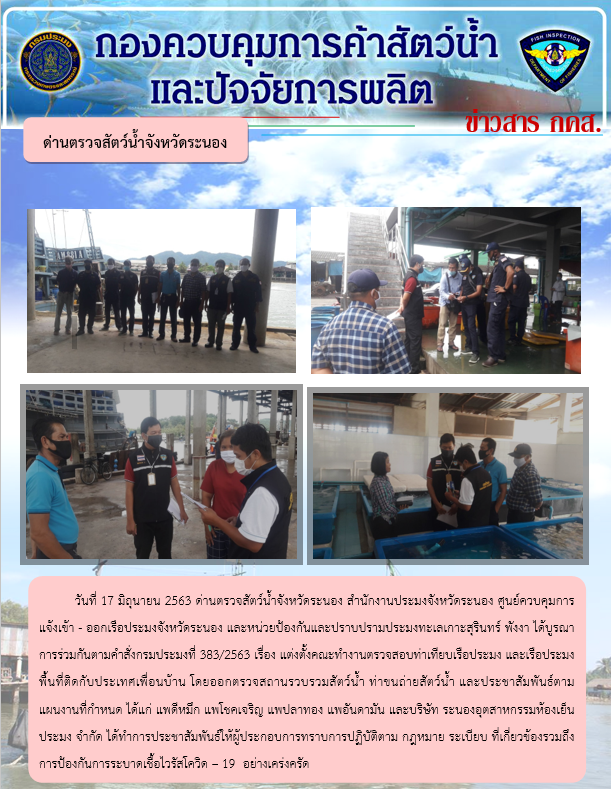 วันที่ 17 มิถุนายน 2563 ด่านตรวจสัตว์น้ำจังหวัดระนอง สำนักงานประมงจังหวัดระนอง ศูนย์ควบคุมการแจ้งเข้า - ออกเรือประมงจังหวัดระนอง และหน่วยป้องกันและปราบปรามประมงทะเลเกาะสุรินทร์ พังงา ได้บูรณาการร่วมกันตามคำสั่งกรมประมงที่ 383/2563 เรื่อง แต่งตั้งคณะทำงานตรวจสอบท่าเทียบเรือประมง และเรือประมงพื้นที่ติดกับประเทศเพื่อนบ้าน โดยออกตรวจสถานรวบรวมสัตว์น้ำ ท่าขนถ่ายสัตว์น้ำ และประชาสัมพันธ์ตามแผนงานที่กำหนด ได้แก่ แพดีหมึก แพโชคเจริญ แพปลาทอง แพอันดามัน และบริษัท ระนองอุตสาหกรรมห้องเย็นประมง จำกัด ได้ทำการประชาสัมพันธ์ให้ผู้ประกอบการทราบการปฏิบัติตาม กฎหมาย ระเบียบ ที่เกี่ยวข้องรวมถึงการป้องกันการระบาดเชื้อไวรัสโควิด – 19  อย่างเคร่งครัด