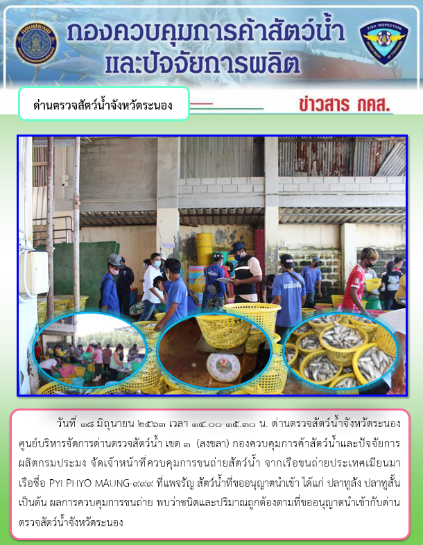 วันที่ 18 มิถุนายน 2563 เวลา 14.00-15.30 น. ด่านตรวจสัตว์น้ำจังหวัดระนอง ศูนย์บริหารจัดการด่านตรวจสัตว์น้ำ เขต 3 (สงขลา) กองควบคุมการค้าสัตว์น้ำและปัจจัยการผลิตกรมประมง จัดเจ้าหน้าที่ควบคุมการขนถ่ายสัตว์น้ำ จากเรือขนถ่ายประเทศเมียนมา เรือชื่อ PYI PHYO MAUNG-999 ที่แพจรัญ สัตว์น้ำที่ขออนุญาตนำเข้า ได้แก่ ปลาทูลัง ปลาทูสั้น เป็นต้น ผลการควบคุมการขนถ่าย พบว่าชนิดและปริมาณถูกต้องตามที่ขออนุญาตนำเข้ากับด่านตรวจสัตว์น้ำจังหวัดระนอง