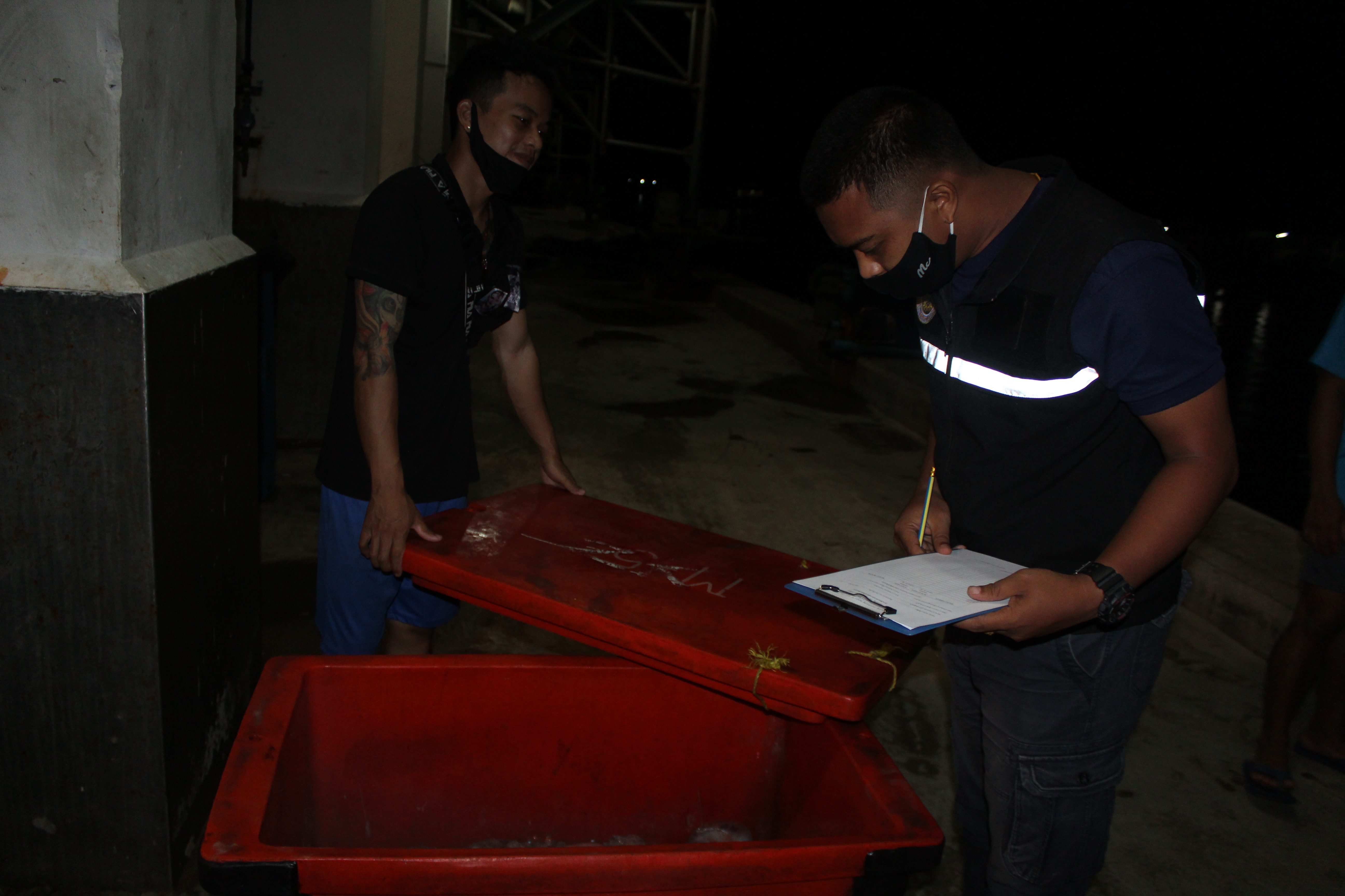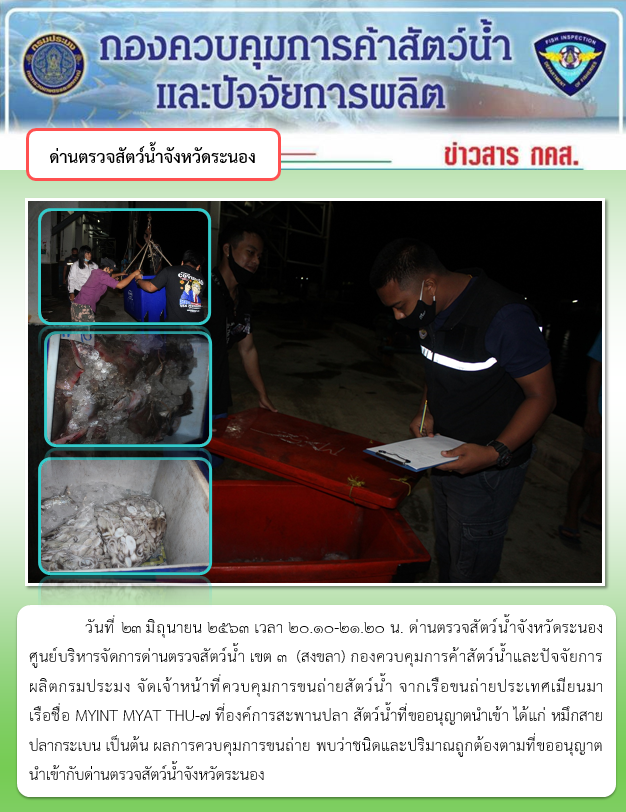 วันที่ 23 มิถุนายน 2563 เวลา 20.10-21.20 น. ด่านตรวจสัตว์น้ำจังหวัดระนอง ศูนย์บริหารจัดการด่านตรวจสัตว์น้ำ เขต 3 (สงขลา) กองควบคุมการค้าสัตว์น้ำและปัจจัยการผลิตกรมประมง จัดเจ้าหน้าที่ควบคุมการขนถ่ายสัตว์น้ำ จากเรือขนถ่ายประเทศเมียนมา เรือชื่อ MYINT MYAT THU-7 ที่องค์การสะพานปลา สัตว์น้ำที่ขออนุญาตนำเข้า ได้แก่ หมึกสาย ปลากระเบน เป็นต้น ผลการควบคุมการขนถ่าย พบว่าชนิดและปริมาณถูกต้องตามที่ขออนุญาตนำเข้ากับด่านตรวจสัตว์น้ำจังหวัดระนอง