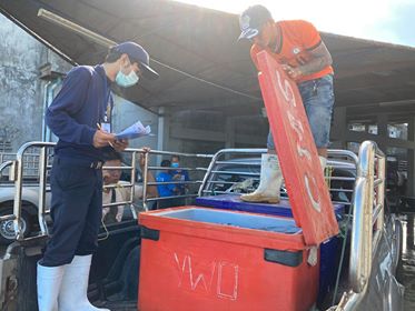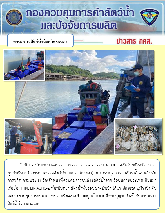 วันที่ 24 มิถุนายน 2563 เวลา 09.00 - 11.30 น. ด่านตรวจสัตว์น้ำจังหวัดระนอง ศูนย์บริหารจัดการด่านตรวจสัตว์น้ำ เขต 3 (สงขลา) กองควบคุมการค้าสัตว์น้ำและปัจจัย การผลิต กรมประมง จัดเจ้าหน้าที่ควบคุมการขนถ่ายสัตว์น้ำจากเรือขนถ่ายประเทศเมียนมา เรือชื่อ HTIKE LIN AUNG-1 ที่แพใบหยก สัตว์น้ำที่ขออนุญาตนำเข้า ได้แก่ ปลาจวด ปูม้า เป็นต้น ผลการควบคุมการขนถ่าย พบว่าชนิดและปริมาณถูกต้องตามที่ขออนุญาตนำเข้ากับด่านตรวจสัตว์น้ำจังหวัดระนอง