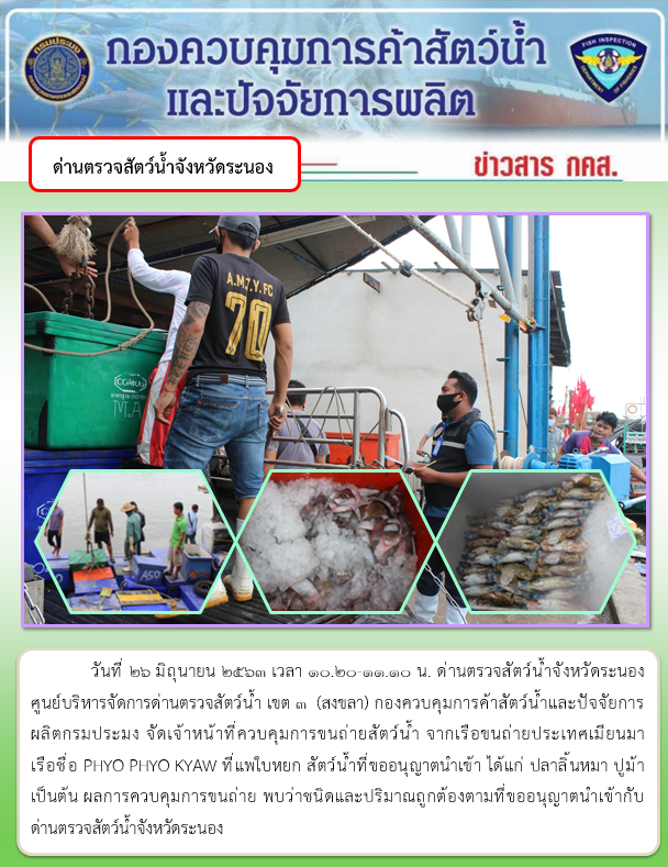 วันที่ 26 มิถุนายน 2563 เวลา 10.20-11.10 น. ด่านตรวจสัตว์น้ำจังหวัดระนอง ศูนย์บริหารจัดการด่านตรวจสัตว์น้ำ เขต 3 (สงขลา) กองควบคุมการค้าสัตว์น้ำและปัจจัยการผลิตกรมประมง จัดเจ้าหน้าที่ควบคุมการขนถ่ายสัตว์น้ำ จากเรือขนถ่ายประเทศเมียนมา เรือชื่อ PHYO PHYO KYAW ที่แพใบหยก สัตว์น้ำที่ขออนุญาตนำเข้า ได้แก่ ปลาลิ้นหมา ปูม้า เป็นต้น ผลการควบคุมการขนถ่าย พบว่าชนิดและปริมาณถูกต้องตามที่ขออนุญาตนำเข้ากับด่านตรวจสัตว์น้ำจังหวัดระนอง