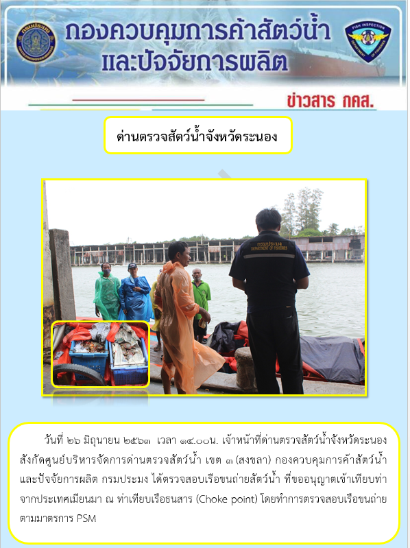 วันที่ 26 มิถุนายน 2563 เวลา 14.00น. เจ้าหน้าที่ด่านตรวจสัตว์น้ำจังหวัดระนอง สังกัดศูนย์บริหารจัดการด่านตรวจสัตว์น้ำ เขต 3 (สงขลา) กองควบคุมการค้าสัตว์น้ำและปัจจัยการผลิต กรมประมง ได้ตรวจสอบเรือขนถ่ายสัตว์น้ำ ที่ขออนุญาตเข้าเทียบท่า จากประเทศเมียนมา ณ ท่าเทียบเรือธนสาร (Choke point) โดยทำการตรวจสอบเรือขนถ่ายตามมาตรการ PSM