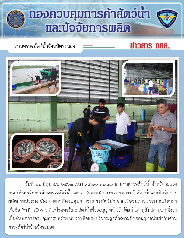 วันที่ 26 มิถุนายน 2563 เวลา 15.10-16.30 น. ด่านตรวจสัตว์น้ำจังหวัดระนองศูนย์บริหารจัดการด่านตรวจสัตว์น้ำ เขต 3 (สงขลา) กองควบคุมการค้าสัตว์น้ำและปัจจัยการผลิตกรมประมง จัดเจ้าหน้าที่ควบคุมการขนถ่ายสัตว์น้ำ จากเรือขนถ่ายประเทศเมียนมาเรือชื่อ PYI PHYO WIN ที่แพโชคพรชัย 2 สัตว์น้ำที่ขออนุญาตนำเข้า ได้แก่ ปลาทูลัง ปลาทูปากจิ้งจก เป็นต้น ผลการควบคุมการขนถ่าย พบว่าชนิดและปริมาณถูกต้องตามที่ขออนุญาตนำเข้ากับด่านตรวจสัตว์น้ำจังหวัดระนอง