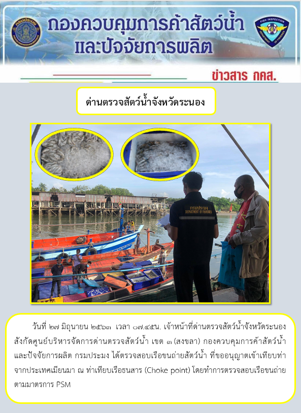วันที่ 27 มิถุนายน 2563 เวลา 07.45น. เจ้าหน้าที่ด่านตรวจสัตว์น้ำจังหวัดระนอง สังกัดศูนย์บริหารจัดการด่านตรวจสัตว์น้ำ เขต 3 (สงขลา) กองควบคุมการค้าสัตว์น้ำ และปัจจัยการผลิต กรมประมง ได้ตรวจสอบเรือขนถ่ายสัตว์น้ำ ที่ขออนุญาตเข้าเทียบท่า จากประเทศเมียนมา ณ ท่าเทียบเรือธนสาร (Choke point) โดยทำการตรวจสอบเรือขนถ่ายตามมาตรการ PSM